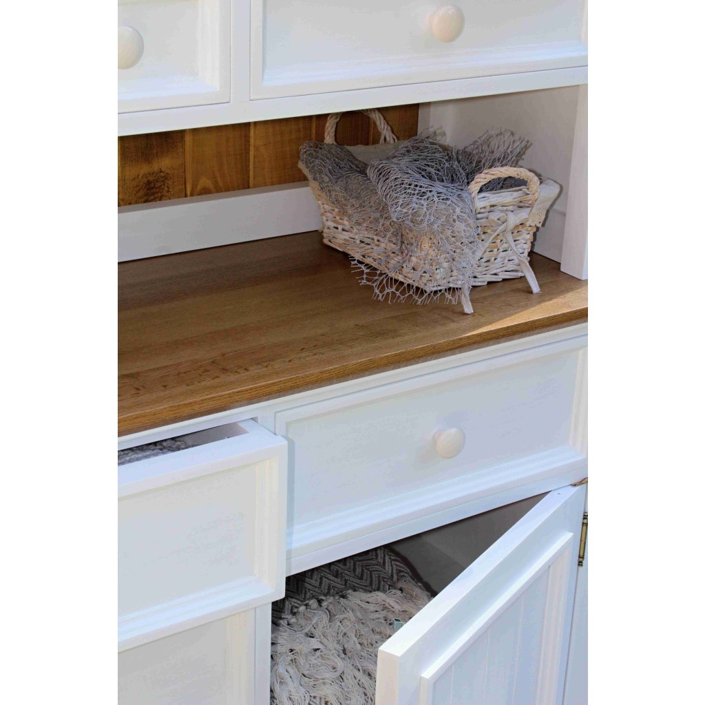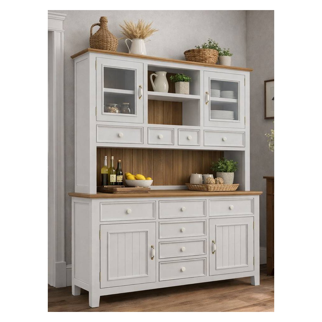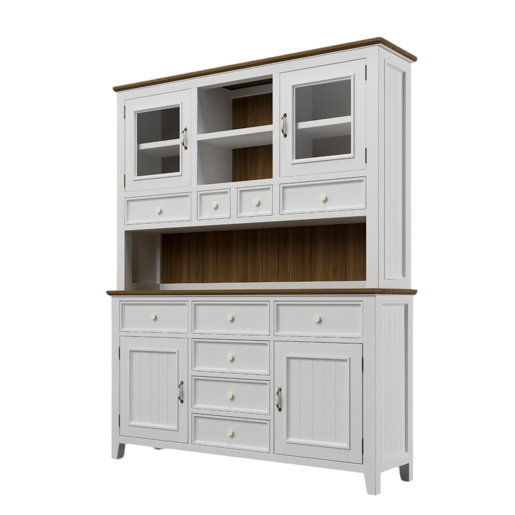 Provensálská kredenc PROVENCE je spojením bukového a dubového dřeva. Dubové dřevo (horní deska) je ošetřeno lakem a bukové dřevo je ošetřeno akrylovou barvou v bílé barvě nebo šedomodré barvě. Šuplíky jsou bez pojezdů. Možnost objednání se systémem tichého dovírání (u šuplíků).