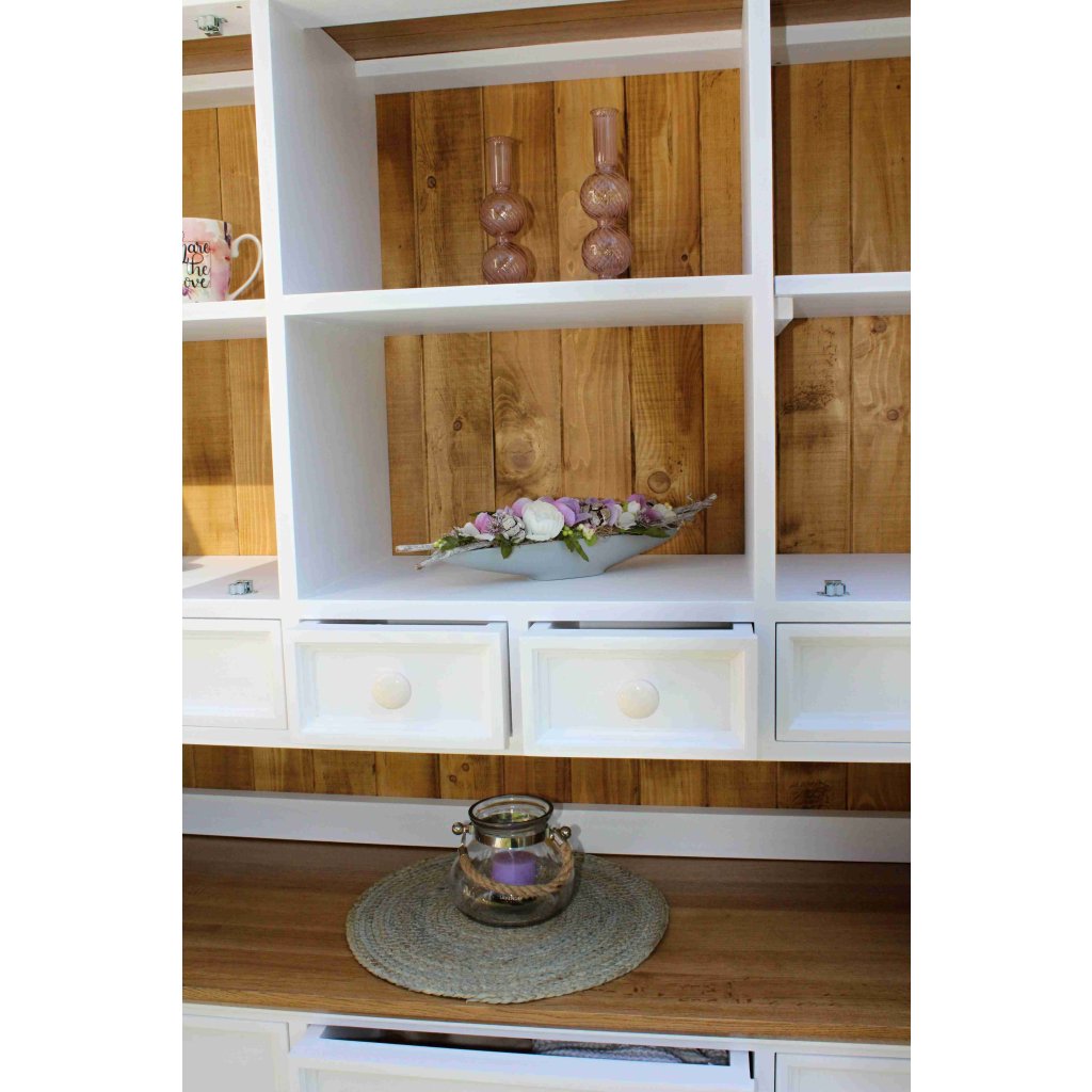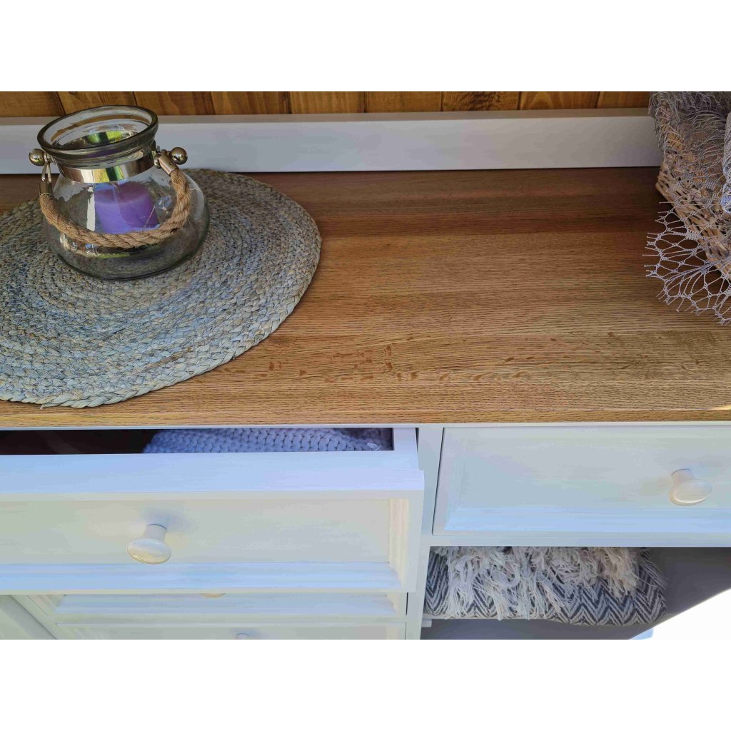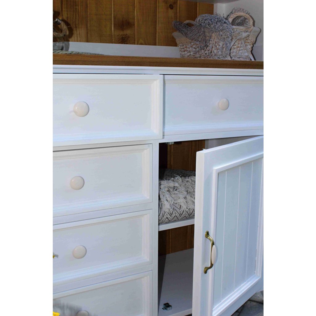 Provensálská kredenc PROVENCE je spojením bukového a dubového dřeva. Dubové dřevo (horní deska) je ošetřeno lakem a bukové dřevo je ošetřeno akrylovou barvou v bílé barvě nebo šedomodré barvě. Šuplíky jsou bez pojezdů. Možnost objednání se systémem tichého dovírání (u šuplíků).