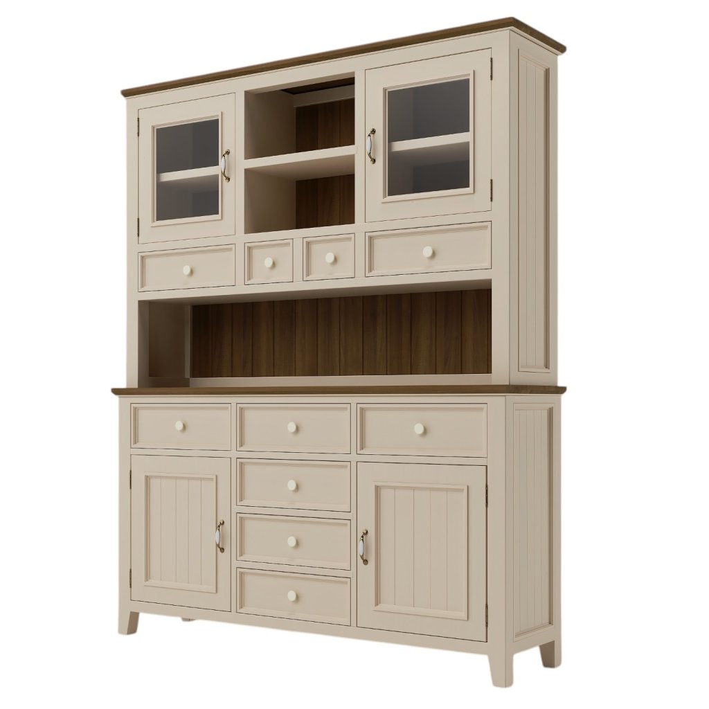 Masivní kredenc PROVENCE je kredenc vyrobená z masivního bukového dřeva, které je ošetřeno akrylovou barvou v krémovém odstínu, a z masivního dubového dřeva (horní deska), které je ošetřeno lakem. Díky spojení těchto dvou druhů masivního dřeva získala masivní kredenc jedinečný vzhled, který zdokonalí Vaši jídelnu a kuchyni.