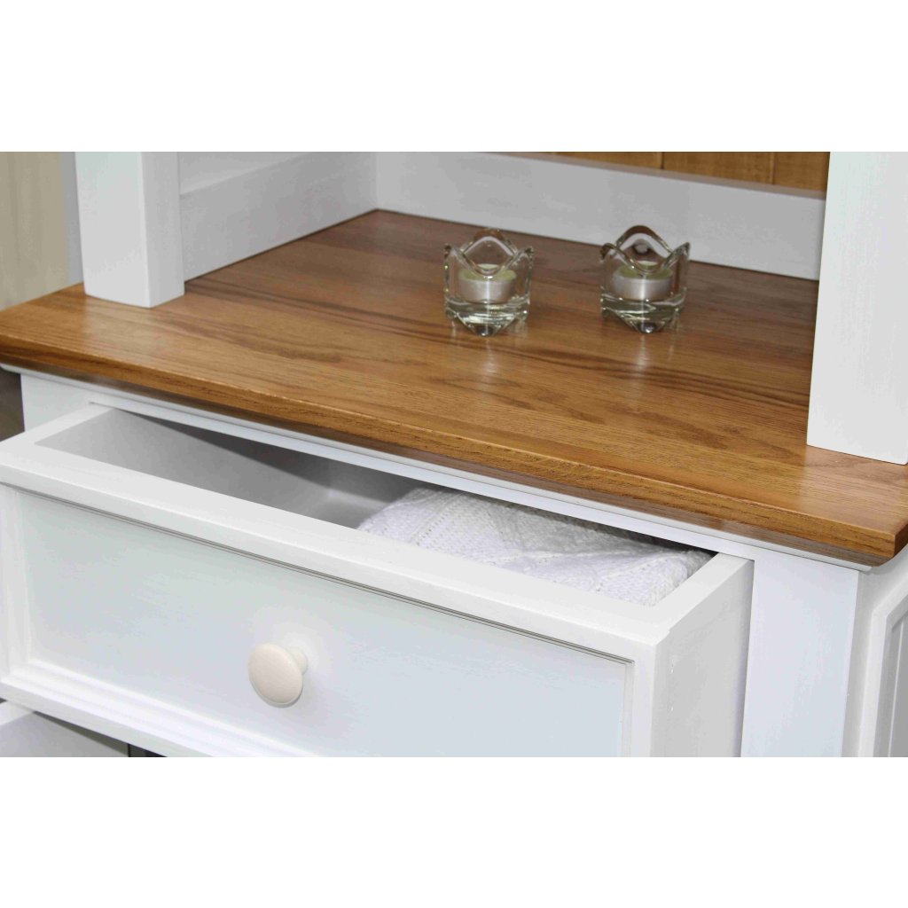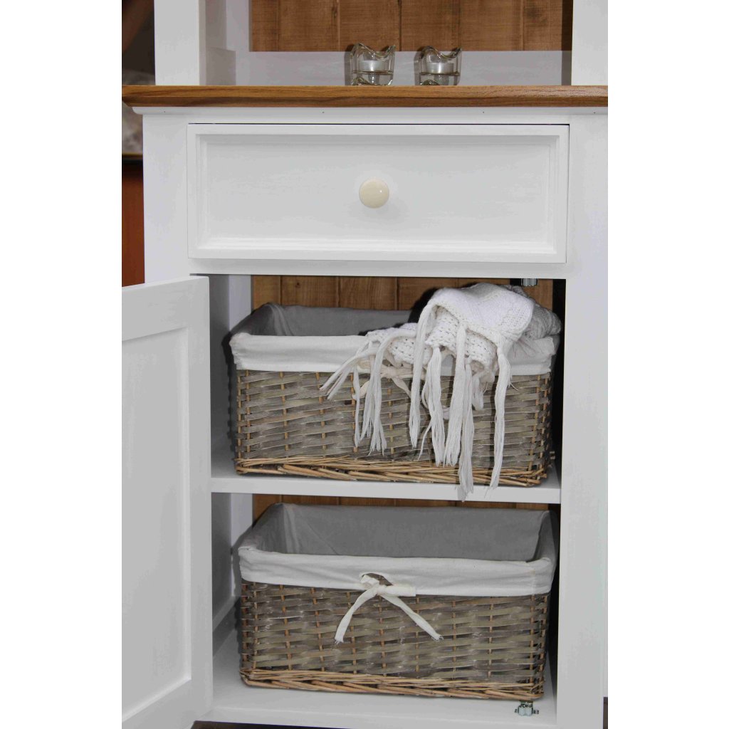 Kredenc z masivu PROVENCE je spojením bukového a dubového dřeva. Dubové dřevo (horní deska) je ošetřeno lakem a bukové dřevo je ošetřeno akrylovou barvou v bílé barvě. Šuplíky jsou bez pojezdů. Možnost objednání se systémem tichého dovírání (u šuplíků).