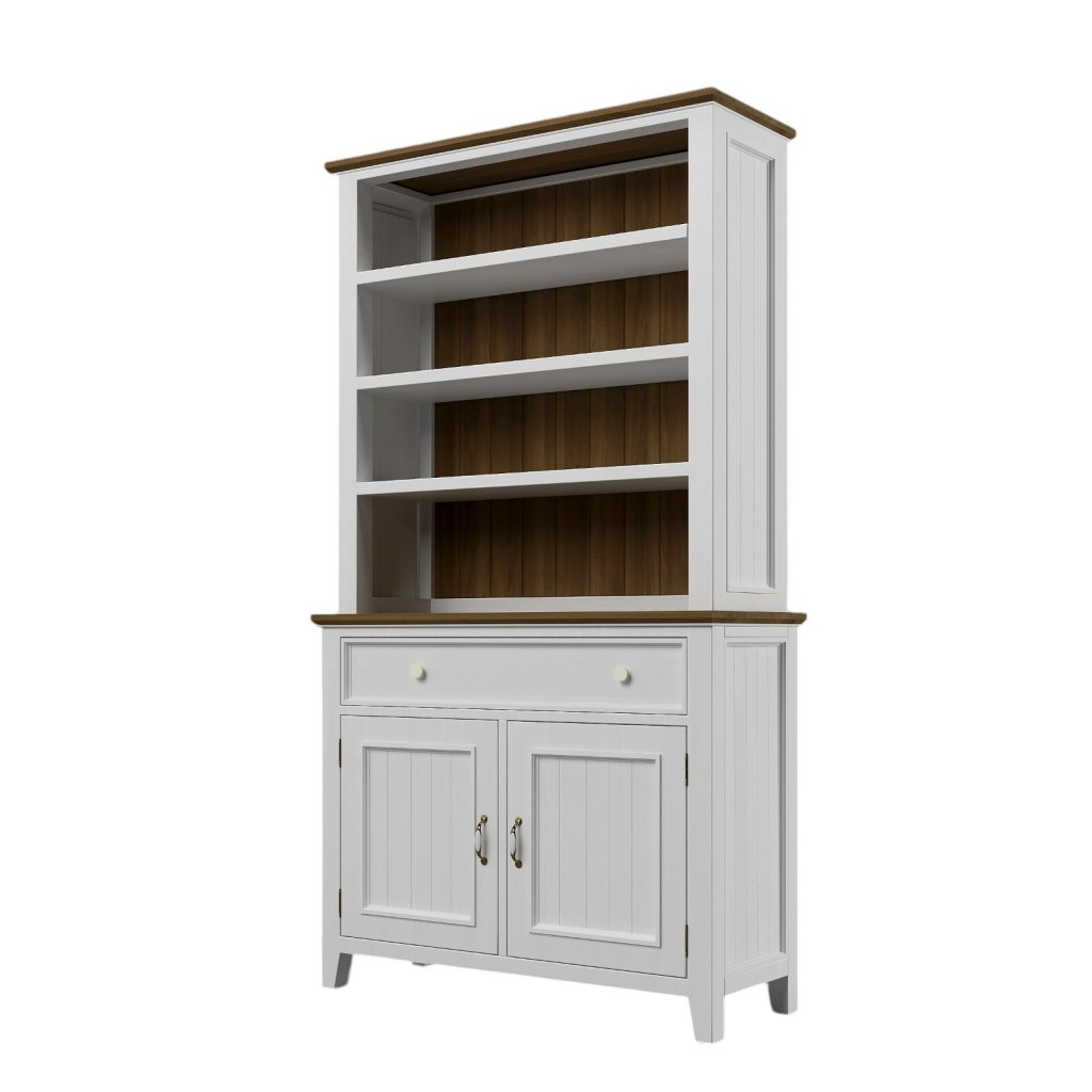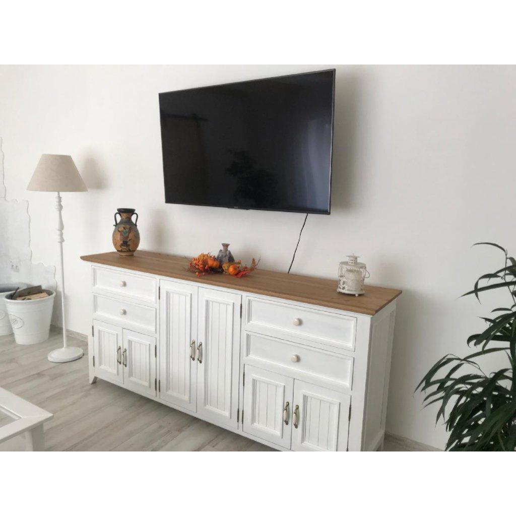 Kredenc z masivu PROVENCE je spojením bukového a dubového dřeva. Dubové dřevo (horní deska) je ošetřeno lakem a bukové dřevo je ošetřeno akrylovou barvou v bílé barvě. Šuplík je bez pojezdů. Možnost objednání se systémem tichého dovírání (u šuplíků).