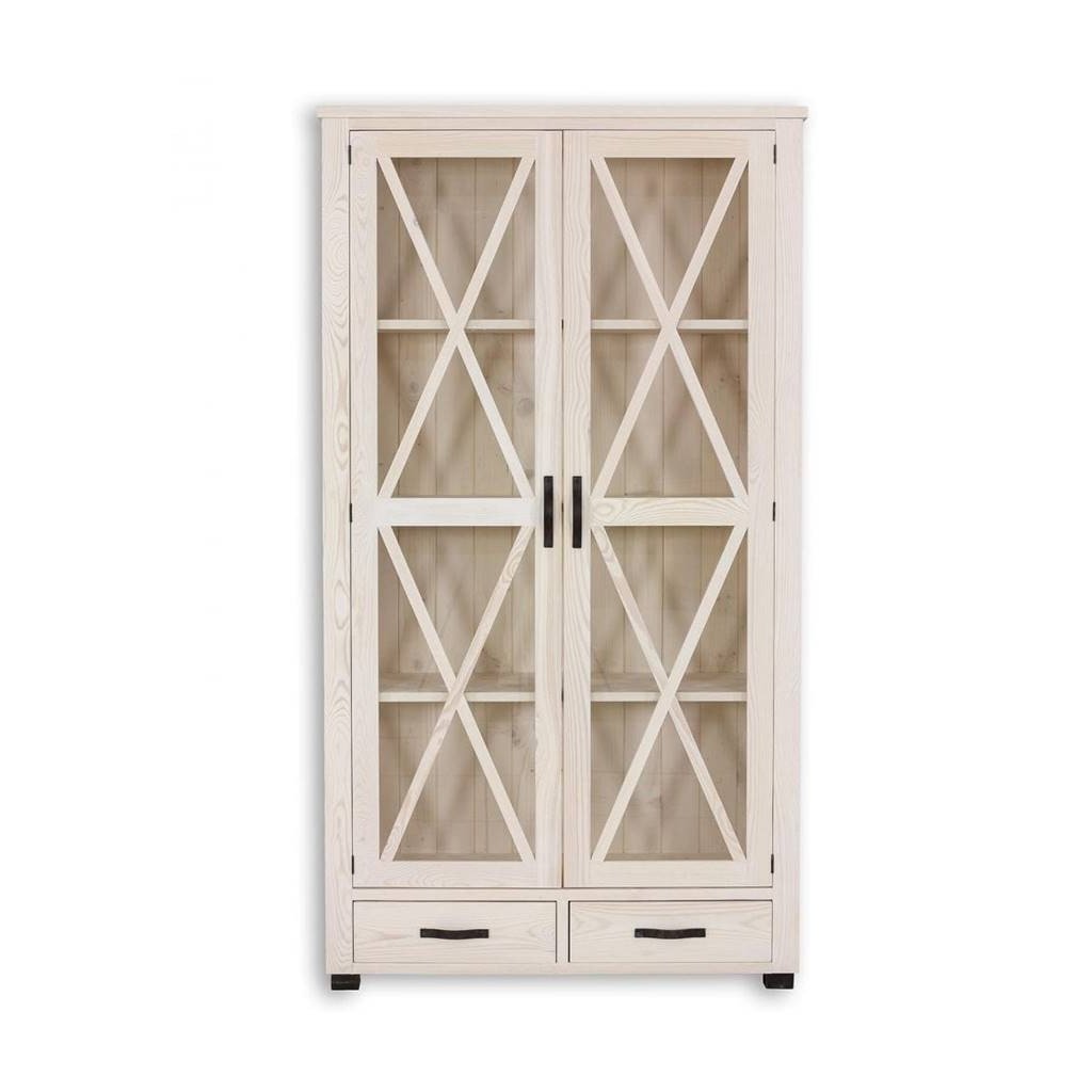 Masivní vitrína METAL 10 je vyrobena z borovicového masivu vysoké kvality. Záda jsou rovněž vyrobena ze dřeva. Vitrína má 2 velké skleněné dveře, jejíchž krása je podtrhnuta ozdobnými kříži. Uvnitř vitríny jsou 3 dřevěné police. Dole jsou 2 praktické šuplíky. Skříň je opatřena stylovými zlatými kovovými úchyty a panty.