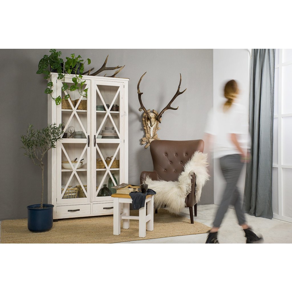 Masivní vitrína METAL 11 má velké prosklené dveře, jejíchž krása je podtrhnuta ozdobnými kříži. Uvnitř jsou tři dřevěné police a ve spodní části se nachází objemná zásuvka, která se vysouvá na dřevěných pojezdech. Skříň je opatřena zlatými kovovými úchyty a panty.