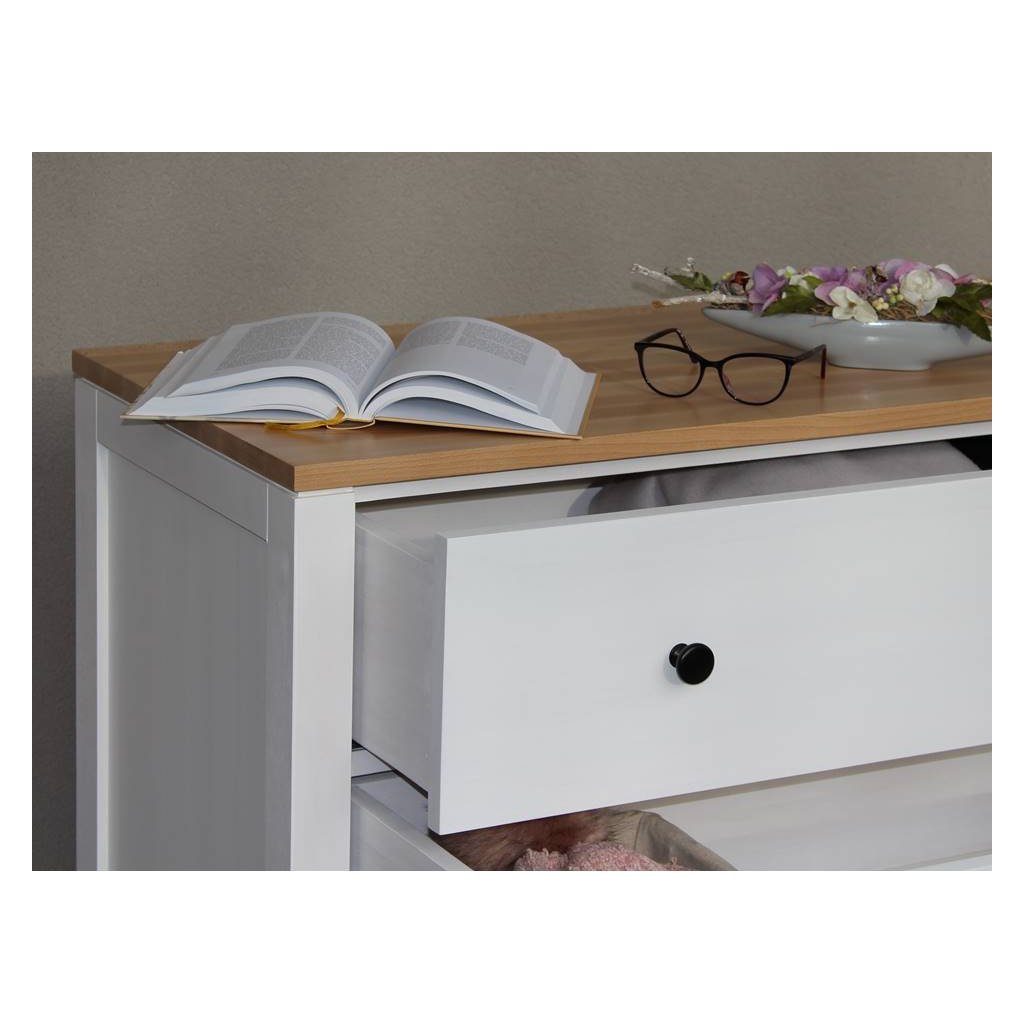 Masivní komoda ROMA White je povrchově upravena vodou ředitelnými akrylovými barvami, které zdůrazní jedinečnou dřevitou kresbu.