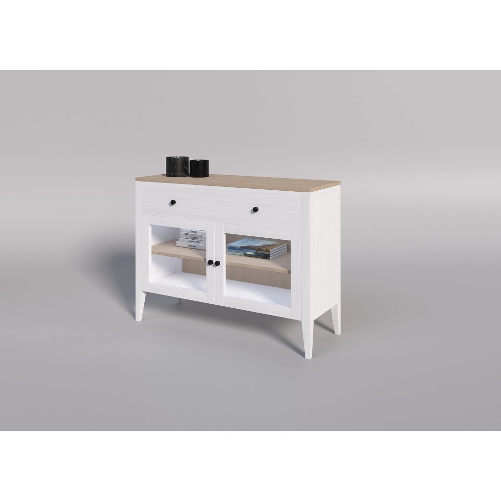 Masivní komoda ROMA White je povrchově upravena vodou ředitelnými akrylovými barvami, které zdůrazní jedinečnou dřevitou kresbu.