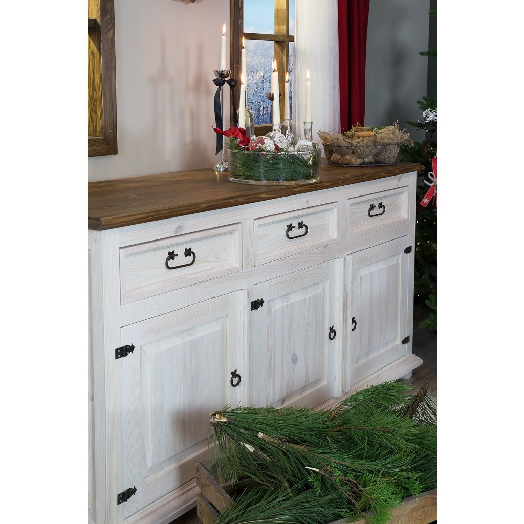 Komoda WHITE HOME Slim je zhotovená z masivní borovice a může být ošetřena voskem v barvě dle výběru. Díky stylovému kování působí tento nábytek elegantním a nadčasovým dojmem.