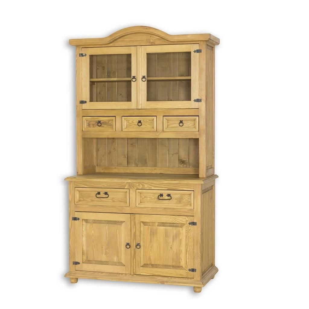 Kredenc CORDOBA 11 je vyrobena z borovicového masivu vysoké kvality. V horní části kredence jsou tři malé zásuvky a skleněné dveře, za kterými je po celé délce police. V dolní části, pod pracovní deskou, jsou dřevěné zásuvky a dveře, za kterými je jedna velká police. Všechny zásuvky jsou na dřevěných lištách. Dvířka i šuplíky otevřete za pomoci stylových úchytů. Vrchní části kredence dominuje originální klenba.
