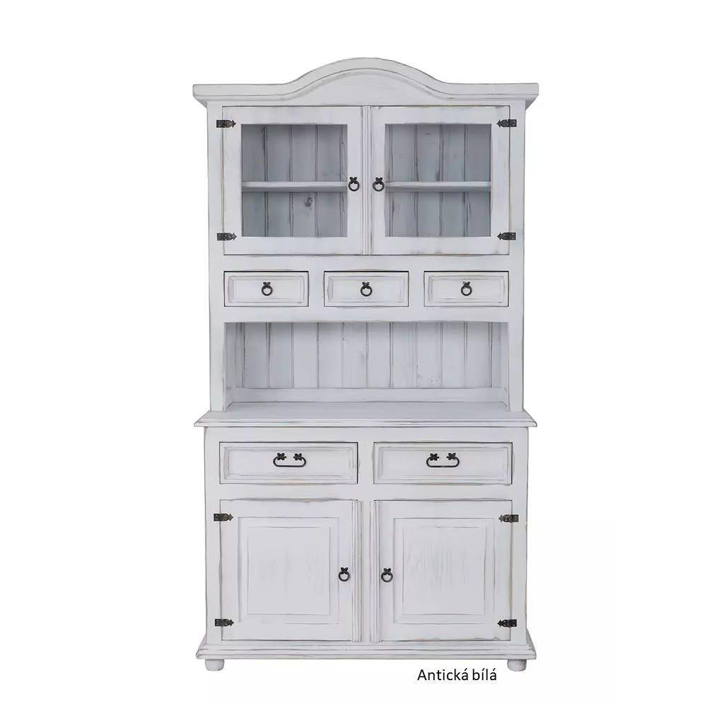 Masivní kredenc WHITE HOME Slim VIT111 se skládá ze dvou dílů. V horní části je policová skříňka se třemi šuplíky. Ve spodní části jsou dvě dřevěné zásuvky a skříňky, v nichž se nachází jedna police. Kredenc stojí na kulatých nožkách.