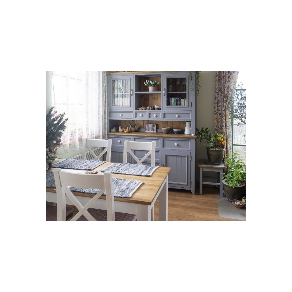 Kolekce PROVENCE to je stylový, vkusný a jemný nábytek v oblíbeném francouzském stylu. Nábytek PROVENCE je vyroben z masivního bukového dřeva a ošetřen akrylovou barvou v bílé, krémové, olivové či šedomodré barvě. Horní hnědé částí jsou rovněž vyrobeny z masivního dřeva a ošetřeny lakem.