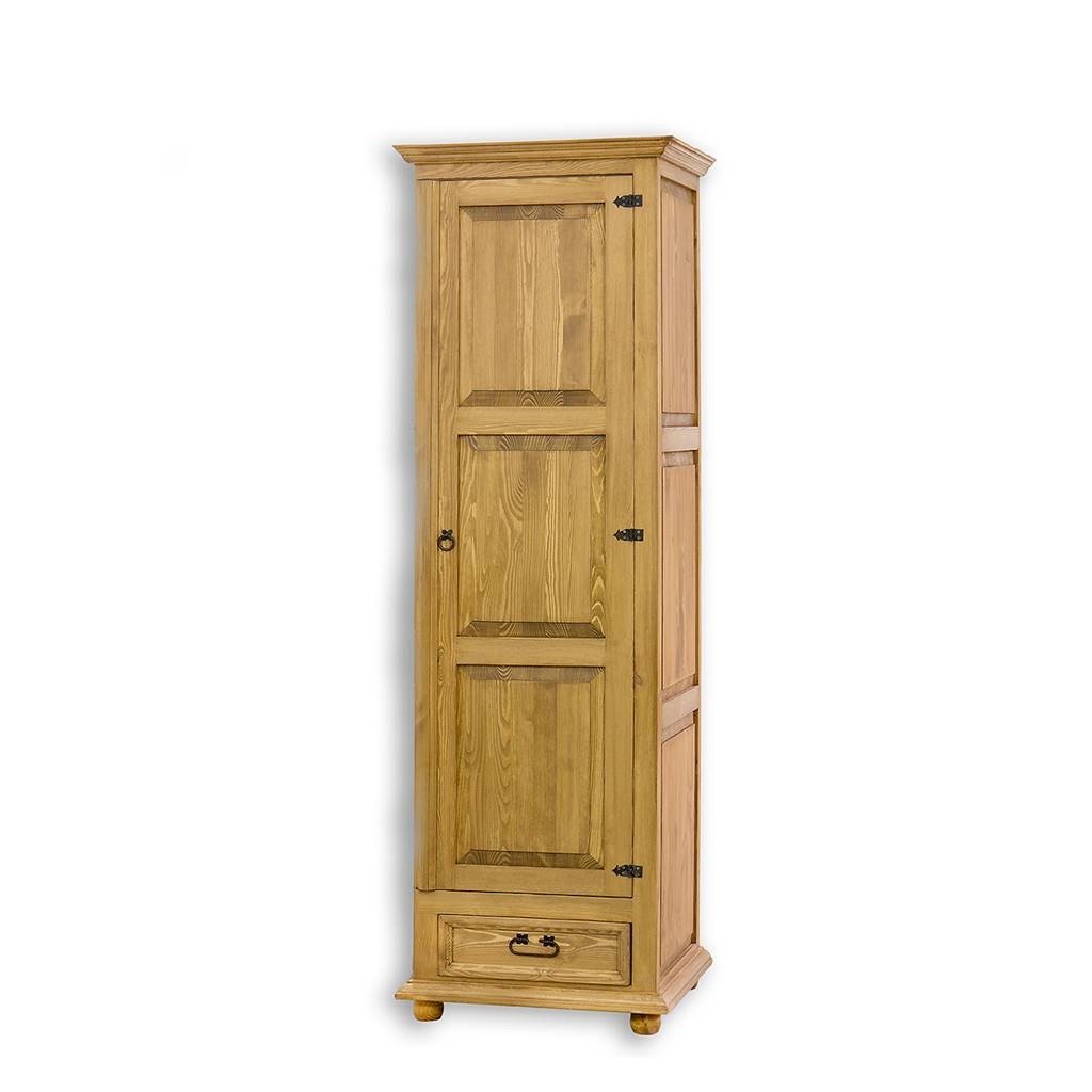 Masivní šatní skříň CORDOBA 02/A je vyrobena z borovicového masivu vysoké kvality. Záda skříně jsou rovněž vyrobeny ze dřeva. U této skříně si můžete zvolit ze 2 variant provedení. A/ s tyčí, za B/ s policemi. U každé varianty je dole 1 praktický šuplík. Skříň je opatřena stylovými kovovými úchyty a panty.