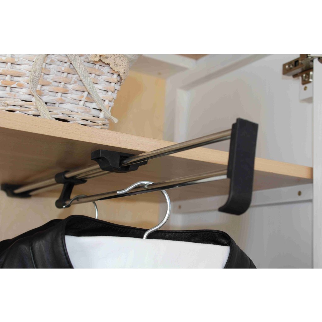Kombinace šatní tyče, police a šuplíku nabídne logické zóny: na ramínka půjdou košile, saka, šaty a kabáty; na police poskládáte svetry, trička, ložní prádlo i úložné boxy. Vnitřek je navržen tak, aby se věci nehromadily a výběr byl intuitivní – ráno sáhnete a jdete.