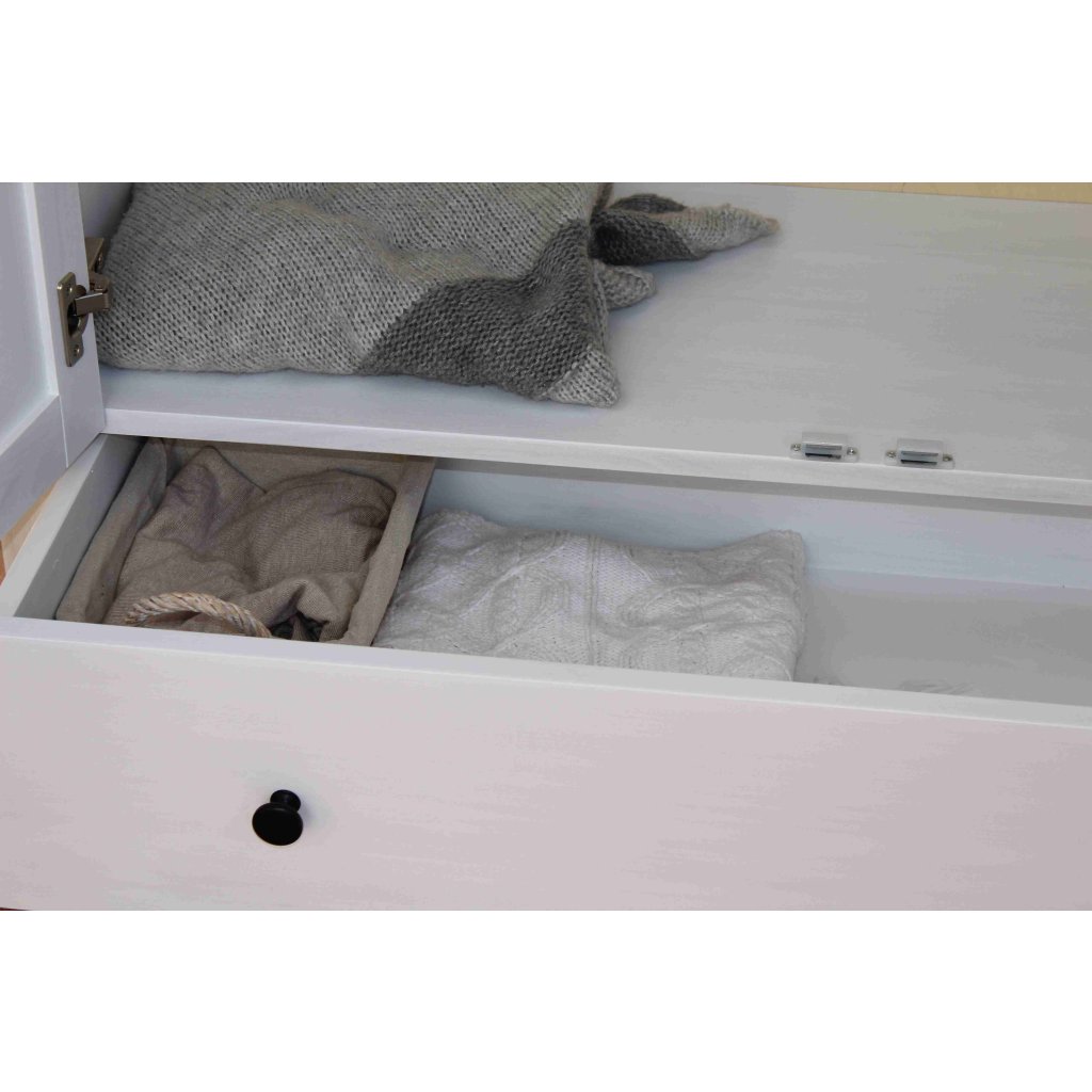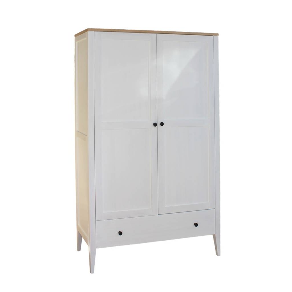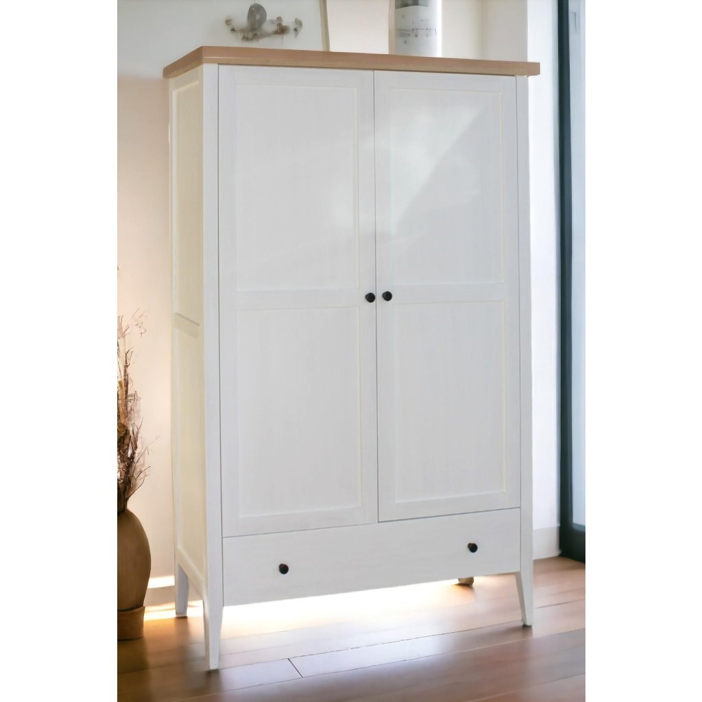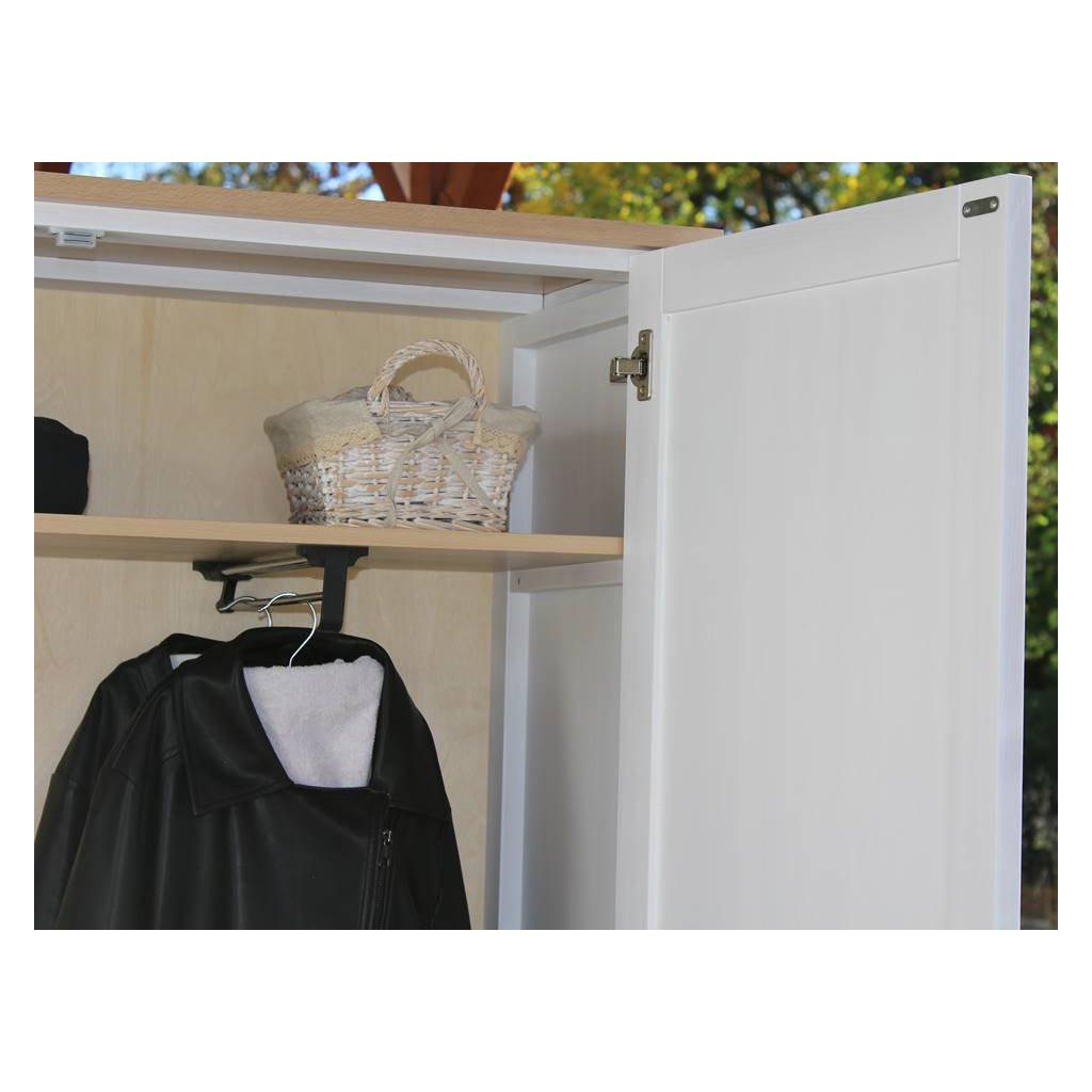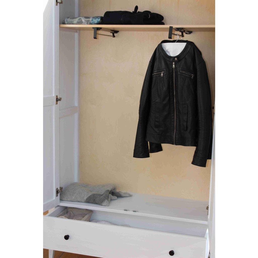 Bukový masiv je tvrdý a houževnatý, takže dobře snáší zátěž věšáků i každodenní otevírání. Bílá povrchová úprava interiér projasní, ale zachová hmatový komfort dřeva. Robustní korpus drží tvar a chrání uložené věci, aby vše zůstalo tak, jak má.