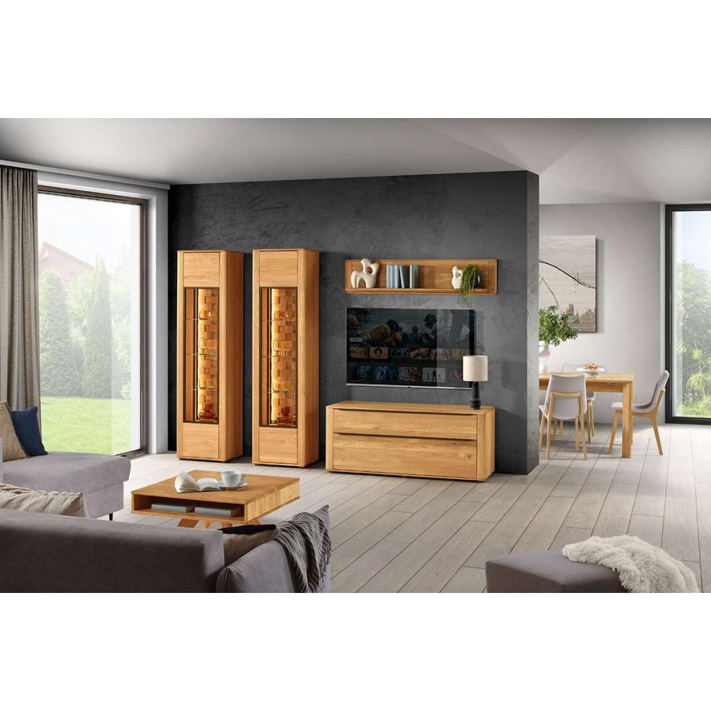 Masivní televizní stolek 21Ggrande je TV stolek vyrobený z masivního dubového dřeva (vrchní a spodní deska, čela zásuvek a dvířek), které je ošetřeno bezbarvým olejem, který usnadňuje péči o dřevo a udržuje jeho přírodní vzhled. Korpus masivního stolku (boční stěny, příčky a police) je vyroben z dubové dýhy.