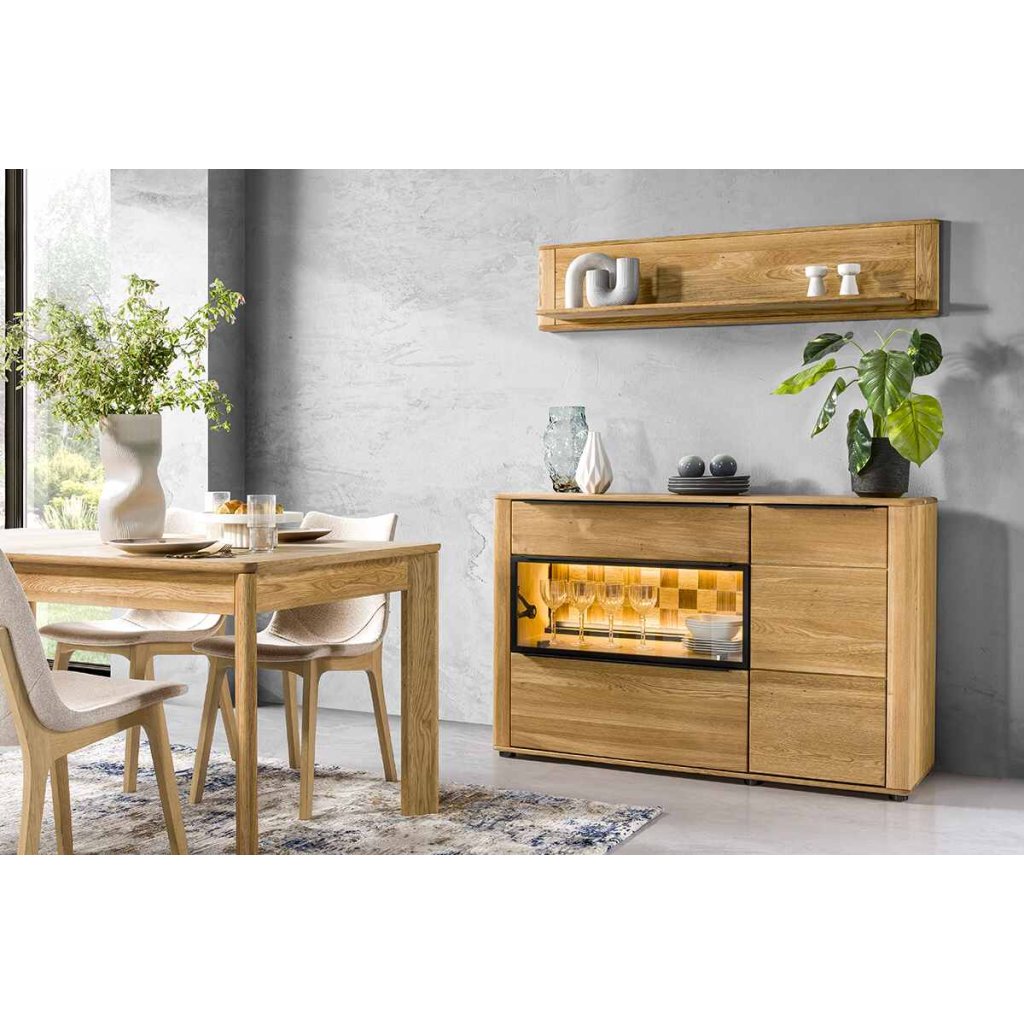 Kolekce grande je elegantní kolekce nábytku, která svým jemným a moderní vzhledem vytvoří domov Vašich snů. Vrchní a spodní deska, čela zásuvek a dvířek jsou vyrobeny z velmi kvalitního dubového masivního dřeva, které je ošetřeno olejem. Bezbarvý olej usnadňuje péči o povrch a udržuje původní kresbu dřeva. Korpus nábytku (boční stěny, příčky a police) je vyroben z dubové dýhy.