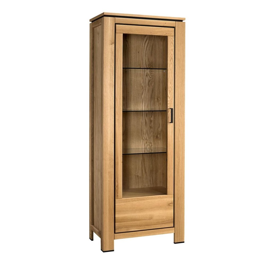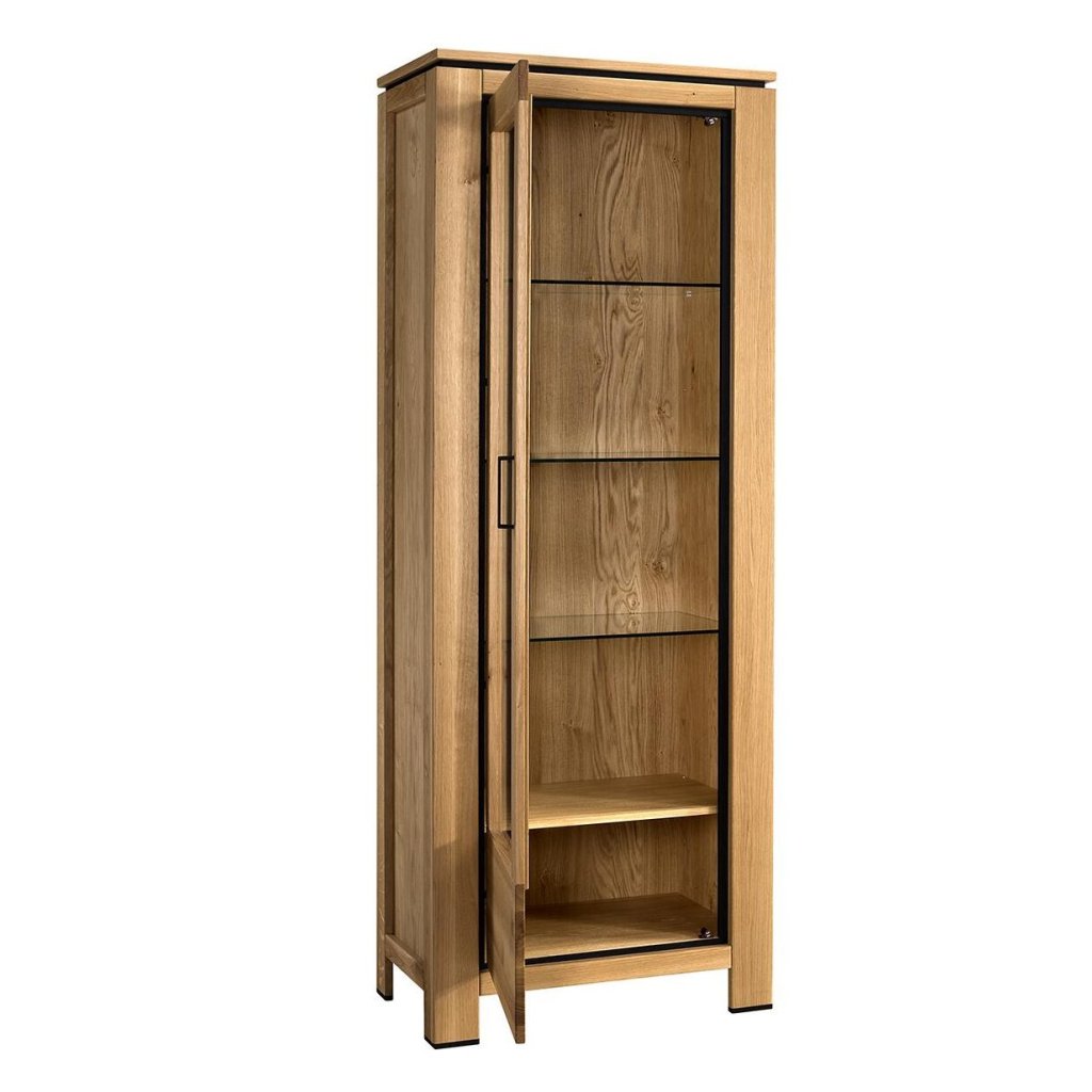 Rozměry vitríny jsou 78 cm na šířku, 208,6 cm na výšku a 47 cm do hloubky — ideální proporce pro výrazný solitér i pro kombinaci s dalšími prvky sestavy. Dubové dřevo přináší do interiéru teplo a přirozenou kresbu, černé detaily zase dodají linku a moderní kontrast. Hodí se do minimalistických interiérů, skandinávského stylu i do klasiky, kterou chcete lehce „odlehčit“.