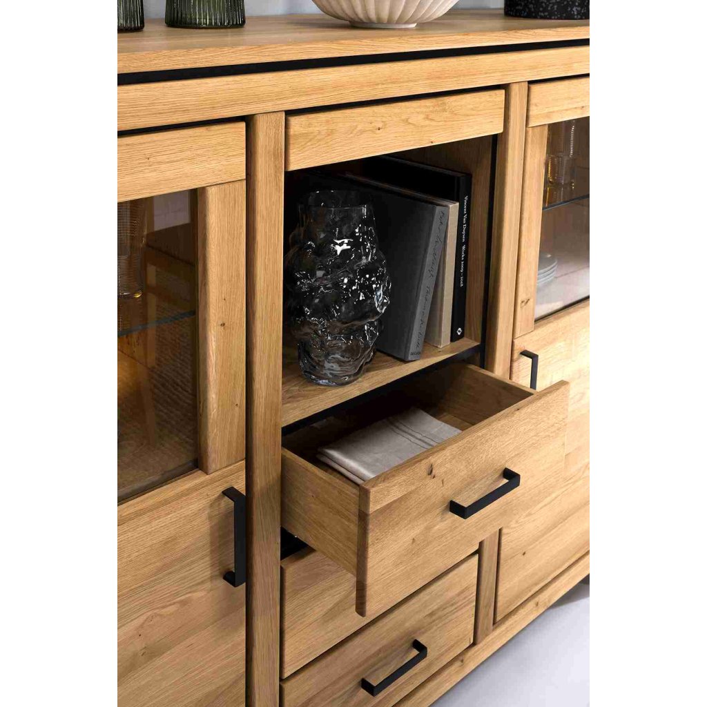 Teplý odstín dubu vytváří příjemnou atmosféru a kontrastní černé prvky podtrhují moderní vzhled celé kolekce Faro II. Kredenc se uplatní zejména v jídelně nebo obývacím pokoji, ale výborně zapadne i do pracovny či větší předsíně. Pro sladění interiéru doporučujeme prohlédnout také nábytek z dubového masivu a další komody z masivu. Pokud chcete vytvořit jednotný set, skvěle se doplňuje i s nábytkem z kolekce Faro II.