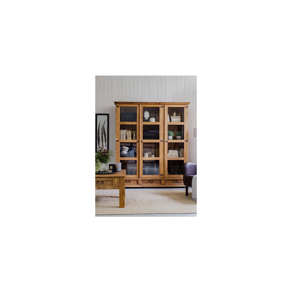 Vitrína CORDOBA Slim je zhotovená z masivní borovice a může být ošetřena voskem v barvě dle výběru. Ze dřeva jsou vyrobeny i záda vitríny. Díky stylovému kování působí tento nábytek elegantním a nadčasovým dojmem.