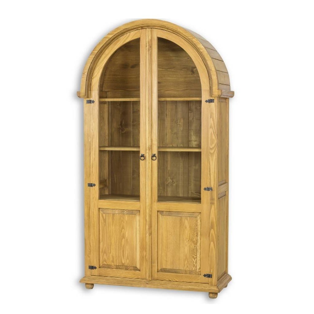 Masivní vitrína CORDOBA 03 je vyrobena z borovicového masivu vysoké kvality. Záda jsou rovněž vyrobeny ze dřeva. Vitrína má 2 velké půlkruhové skleněné dveře. Uvnitř vitríny jsou 3 dřevěné police a stojí na kulatých nožkách. Skříň je opatřena stylovými kovovými úchyty a panty.