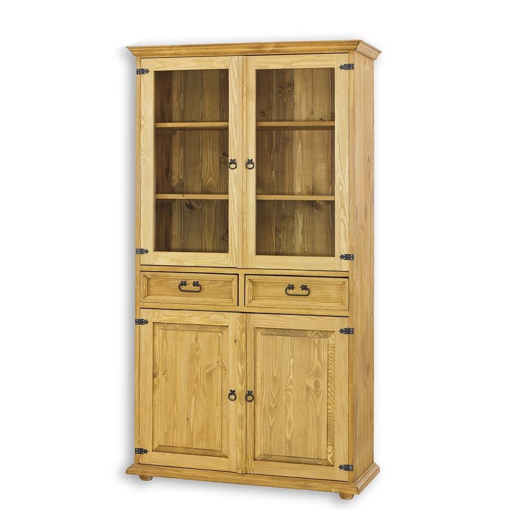 Masivní vitrína CORDOBA 13 je vyrobena z borovicového masivu vysoké kvality. Záda jsou rovněž vyrobeny ze dřeva.V horní části jsou dvojité skleněné dveře, za nimiž jsou 2 dřevěné police. Níže jsou 2 zásuvky, které se vysouvají po dřevěných lištách. Ve spodní části jsou dvojité dřevěné dveře, za nimiž je 1 dřevěná police. Celá vitrína stojí na kulatých nožkách. Dole jsou 2 praktické šuplíky. Skříň je opatřena stylovými kovovými úchyty a panty.