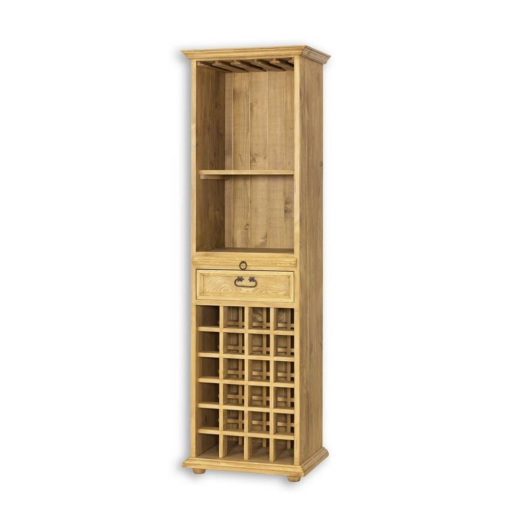 Masivní vitrína CORDOBA 14 je vyrobena z borovicového masivu vysoké kvality. Záda jsou rovněž vyrobeny ze dřeva. Vitrína je vybavena ve spodní části speciálními přihrádkami na vína, zatímco v horní části je prostor pro zavěšení sklenic. Spodní a horní části jsou od sebe odděleny speciální vysouvací policí pro snadné nalévání nápoje. Pod policí je prostorná zásuvka. Skříňka stojí na 4 nožkách ve tvaru koule. Vitrína je opatřena stylovými kovovými úchyty a panty.