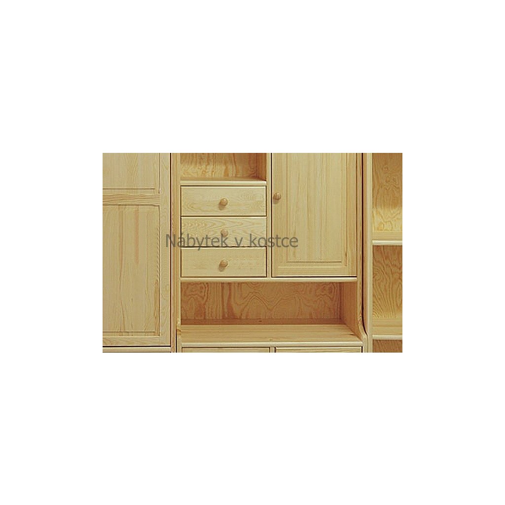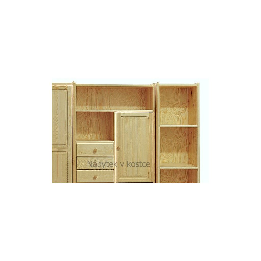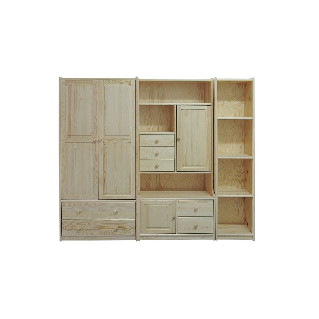 Nábytková stěna z masivu DEJ73 se dokonale hodí pro Vaše knihy, oblečení, věci do školy a další předměty k uskladnění. Tato nábytková stěna kombinuje otevřené poličky, na které můžete uložit knihy, poličky uzavíratelné dvířky, skřínku s tyčí na věšáky a výsuvné šuplíky. Všechny šuplíky jsou na kvalitních kovových pojezdech. Nábytková stěna z masivu DEJ73 je vyrobená z masivního borovicového dřeva s důrazem na využití minimálního množství suků. Pouze zadní část nábytkové stěny je ze sololitu.