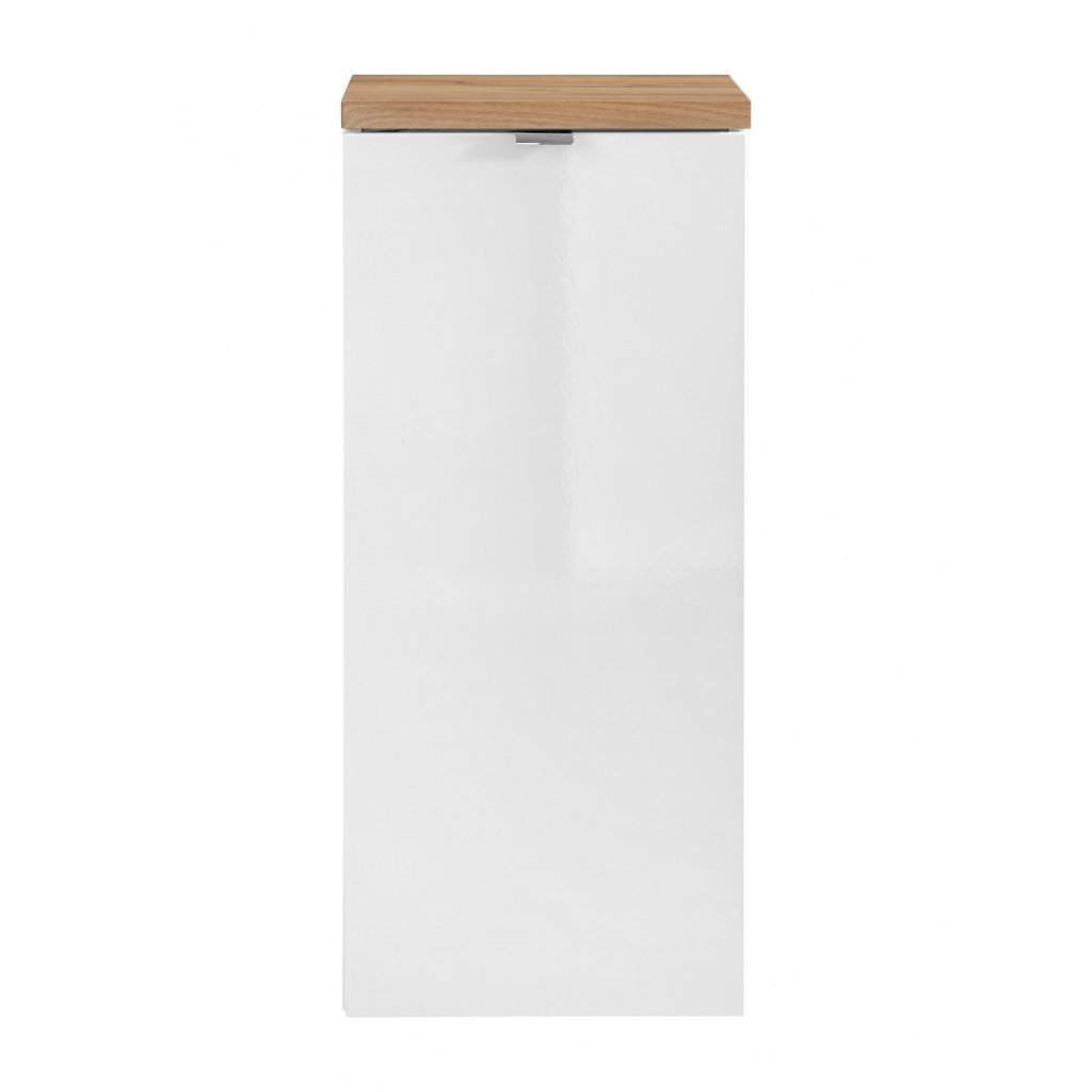 Nabízená skříňka s košem na prádlo je vyrobena z kvalitního MDF materiálu bílého zbarvení. Bělavý lesklý povrch, který působí vysoce moderně a rozjasňuje místnost, je zde doplněn horní deskou s hřejivým dřevěným dekorem, který usnadní vytvoření příjemné atmosféry ve vaší koupelně.