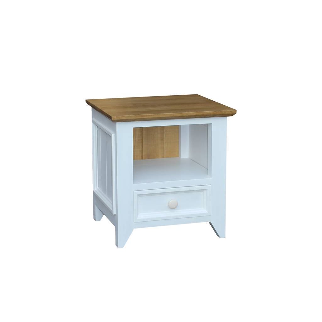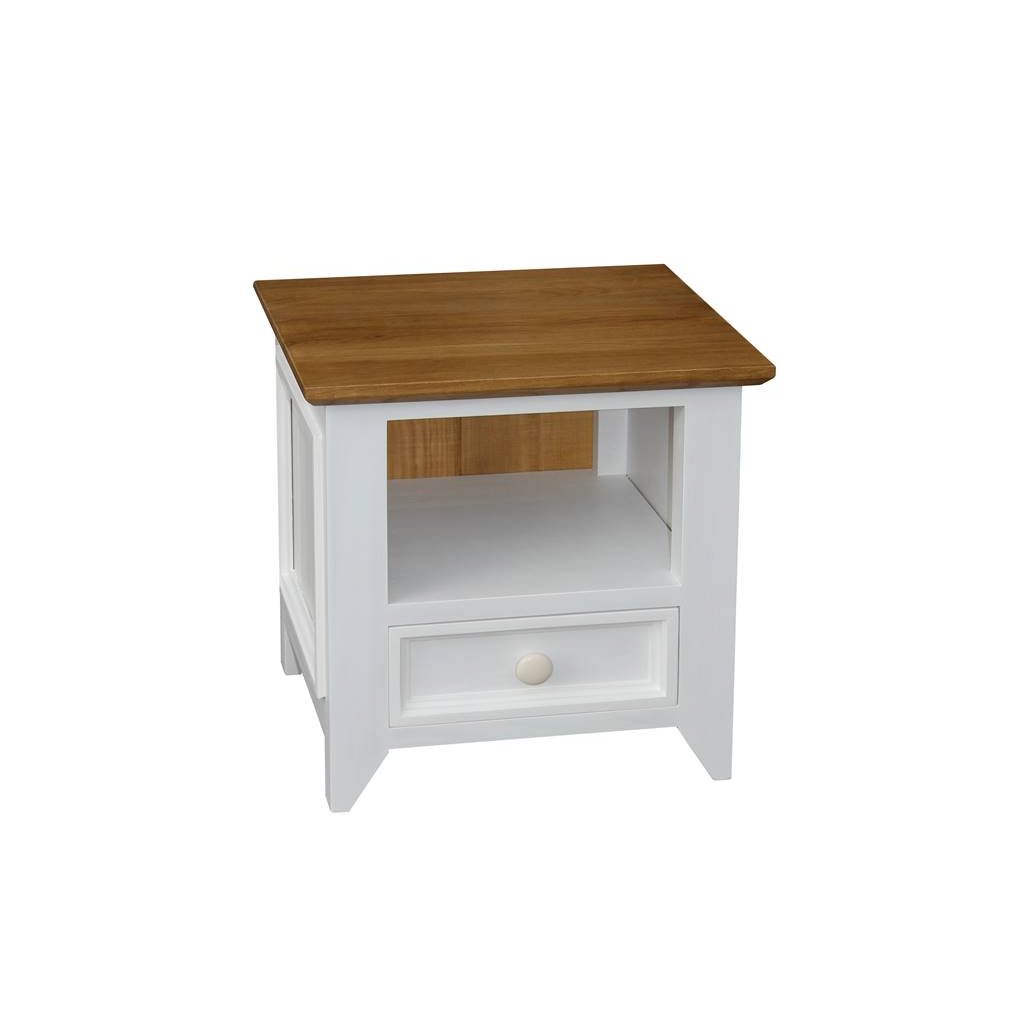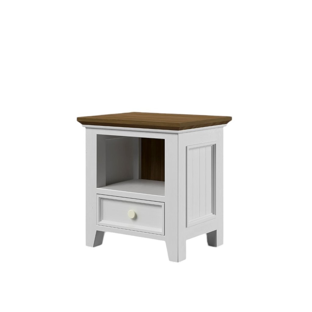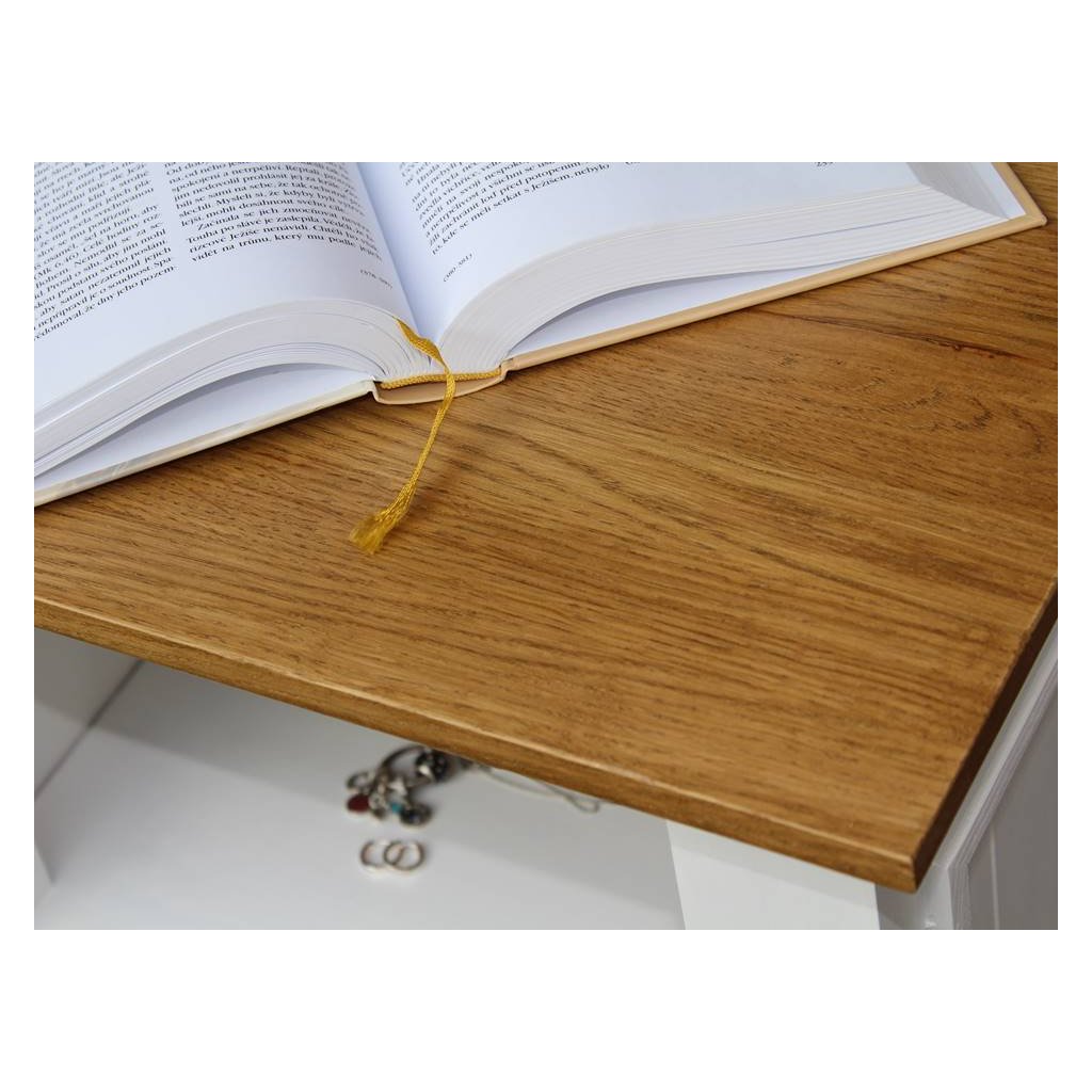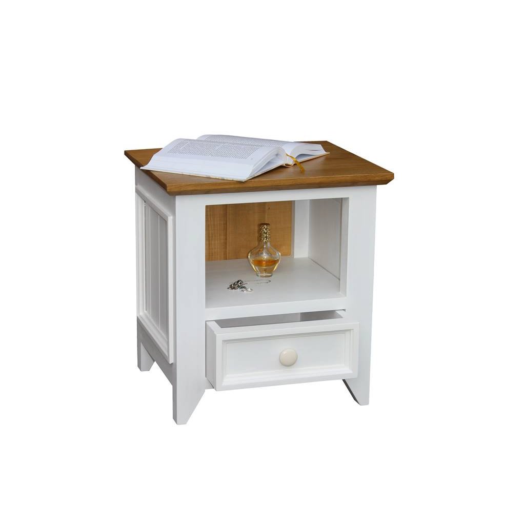 Noční stolek z masivu PROVENCE je spojením bukového a dubového dřeva. Dubové dřevo (horní deska) je ošetřeno lakem a bukové dřevo je ošetřeno akrylovou barvou v bílé barvě. Šuplík je bez pojezdu. Možnost objednání se systémem tichého dovírání (u šuplíků).