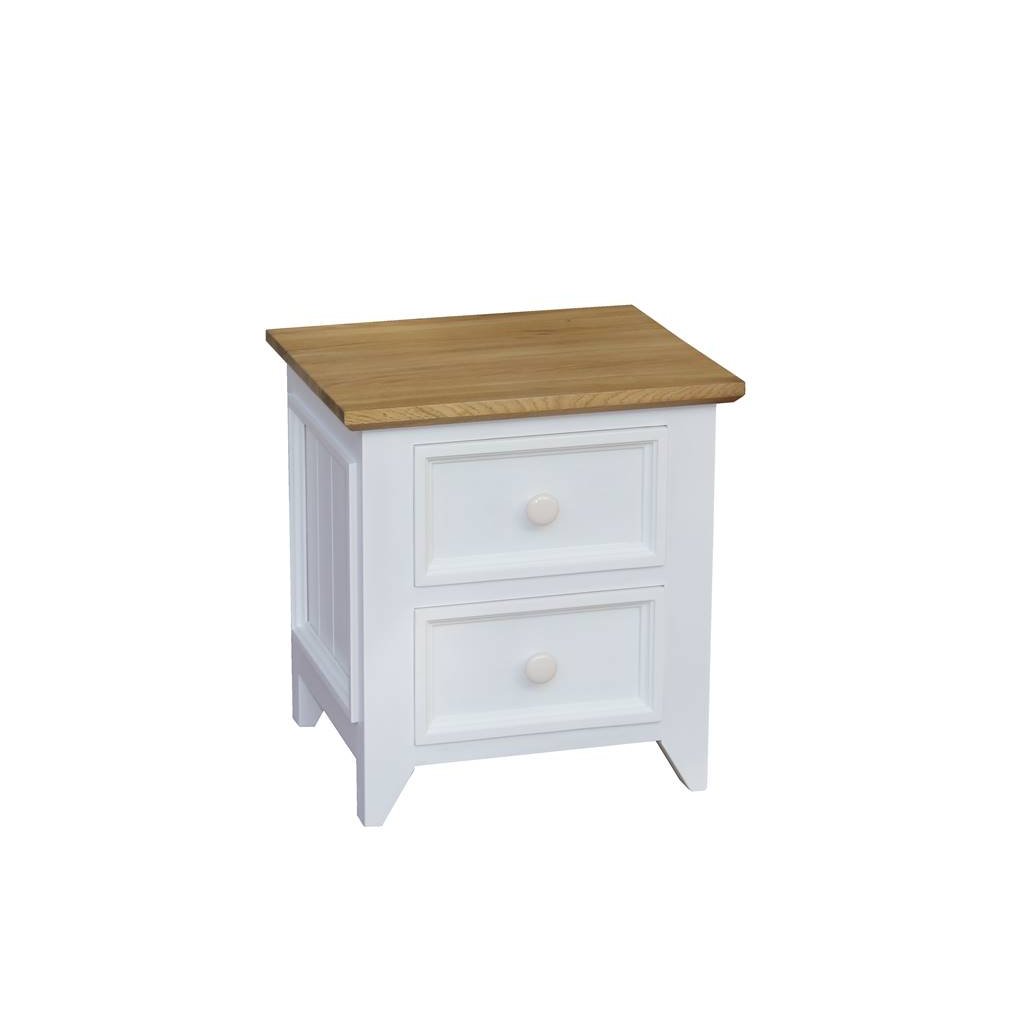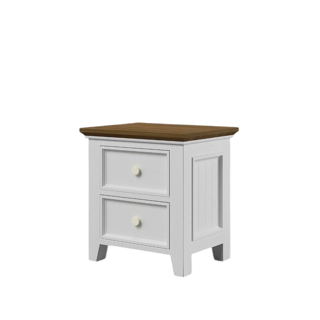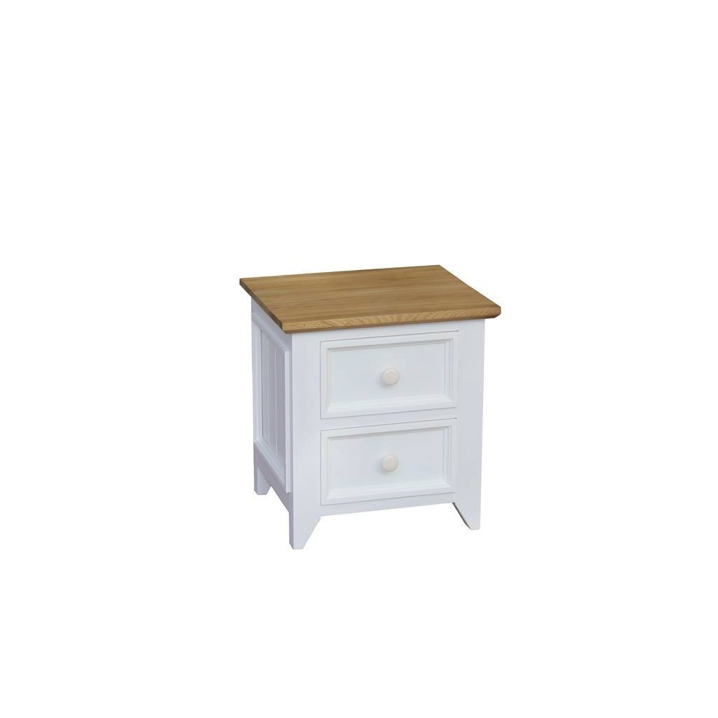 Noční stolek z masivu PROVENCE je spojením bukového a dubového dřeva. Dubové dřevo (horní deska) je ošetřeno lakem a bukové dřevo je ošetřeno akrylovou barvou v bílé, krémové, olivové anebo šedomodré barvě.