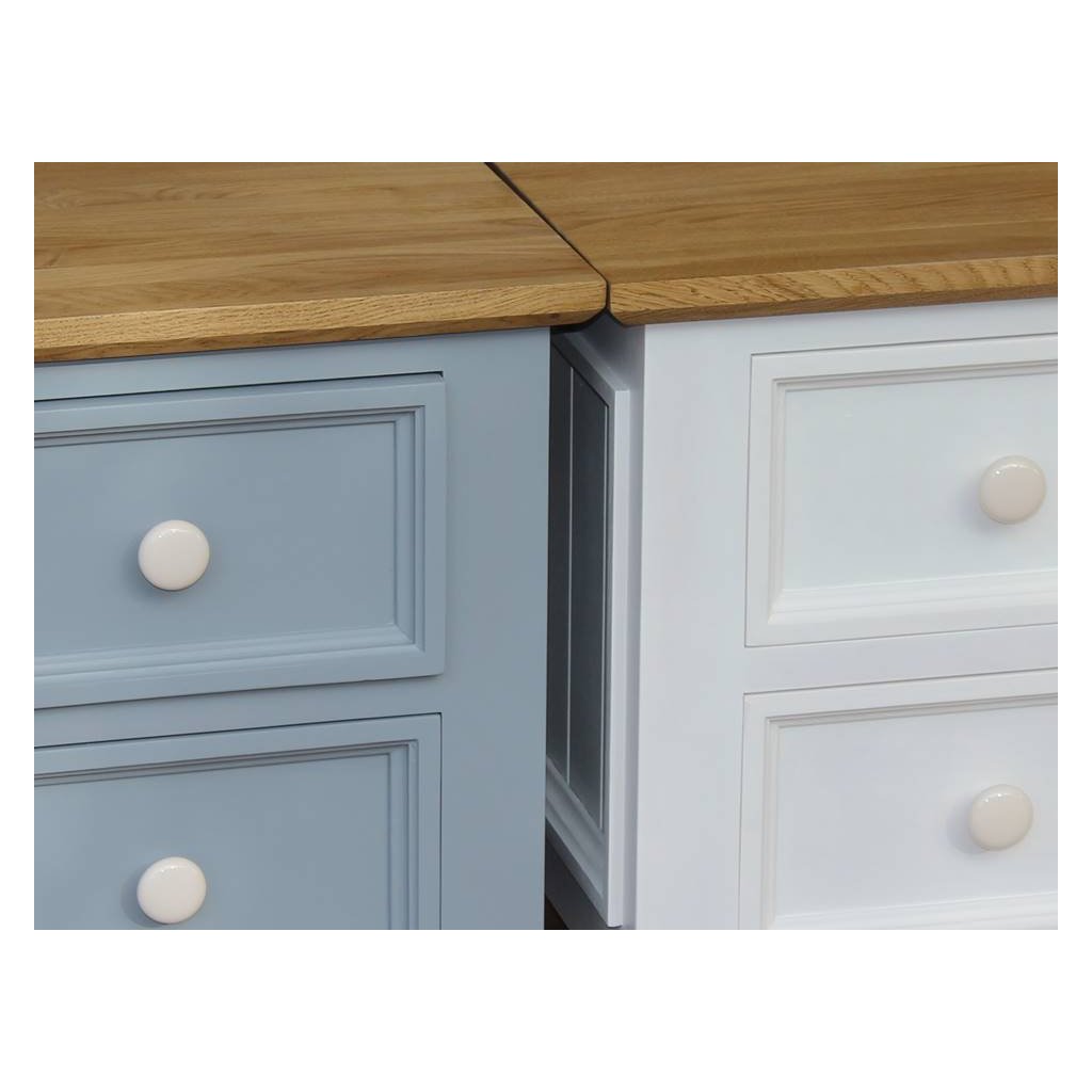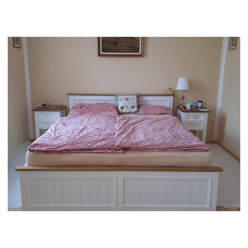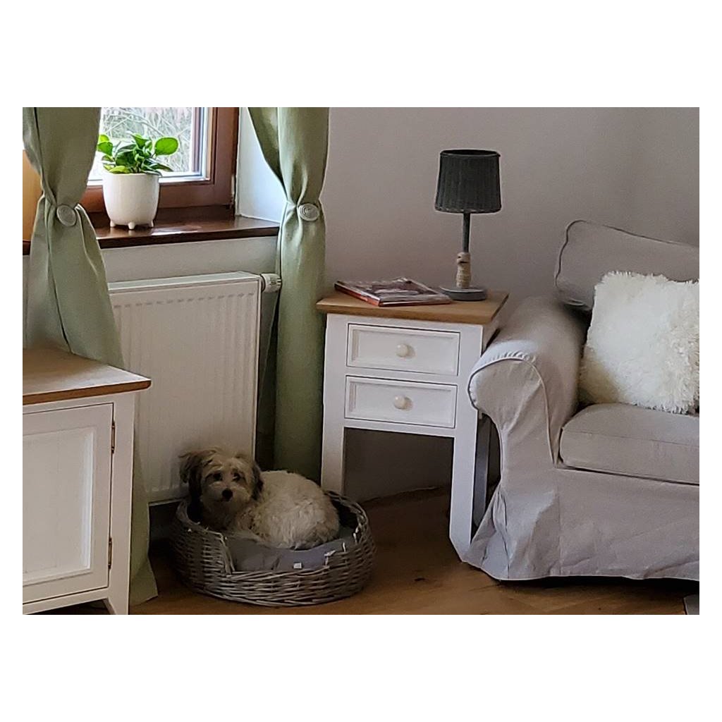 Noční stolek z masivu PROVENCE je spojením bukového a dubového dřeva. Dubové dřevo (horní deska) je ošetřeno lakem a bukové dřevo je ošetřeno akrylovou barvou v bílé, krémové, olivové anebo šedomodré barvě.
