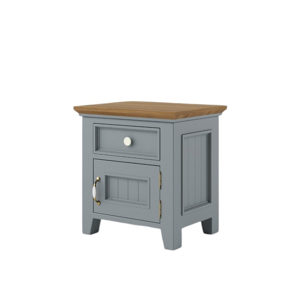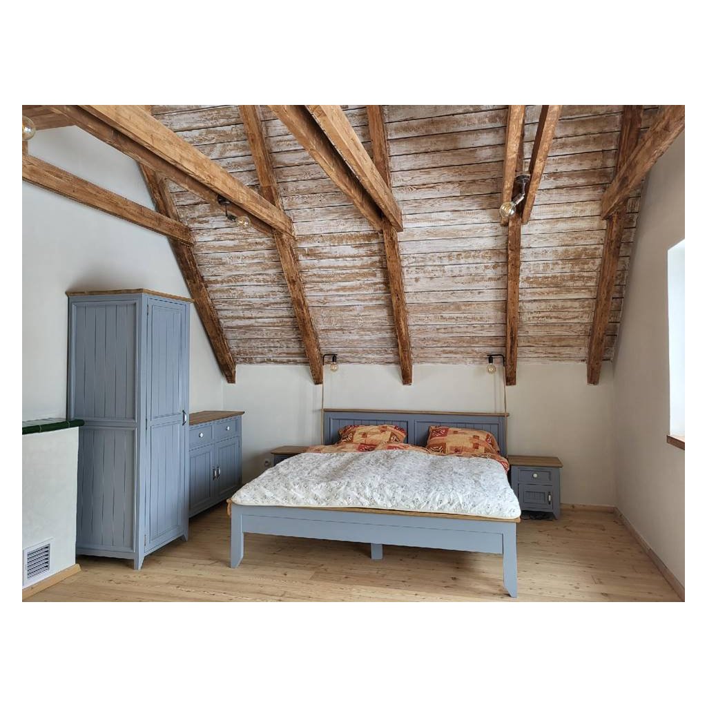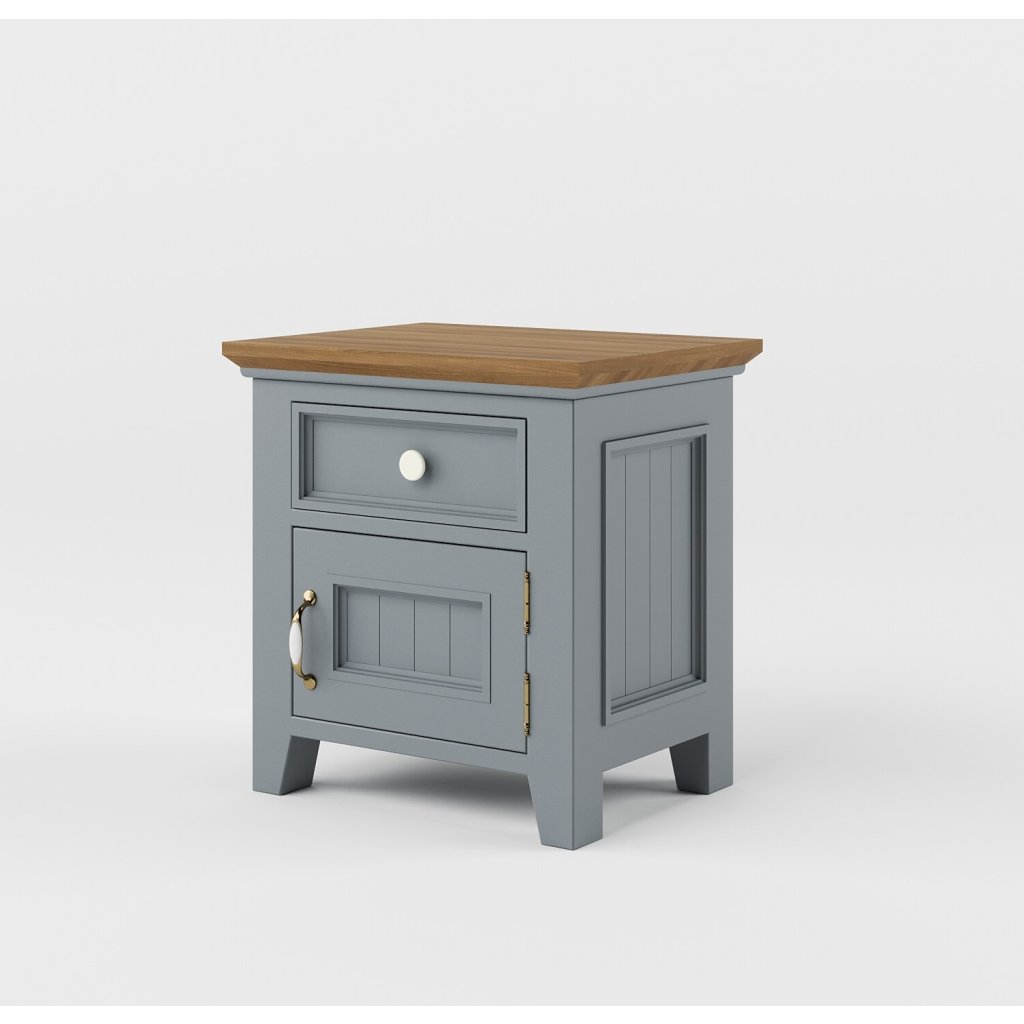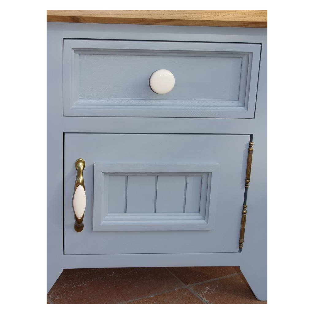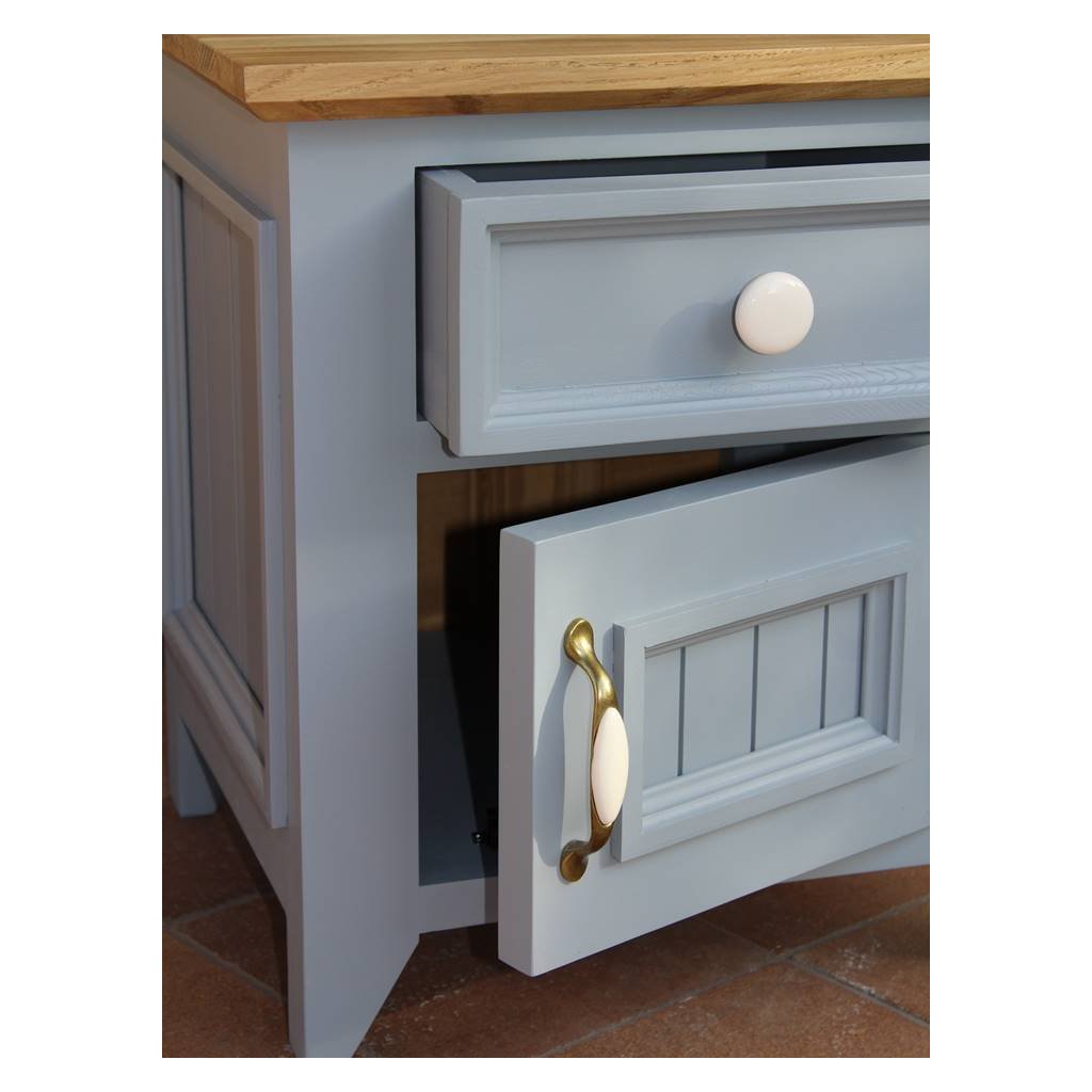Masivní noční stolek PROVENCE je spojením bukového a dubového dřeva. Dubové dřevo (horní deska) je ošetřeno lakem a bukové dřevo je ošetřeno akrylovou barvou v šedomodré barvě. Šuplíky jsou bez pojezdu. Možnost objednání se systémem tichého dovírání (u šuplíků). Příplatek 810,- Kč (jeden pár).