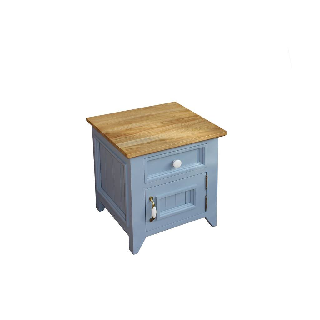 Masivní noční stolek PROVENCE je spojením bukového a dubového dřeva. Dubové dřevo (horní deska) je ošetřeno lakem a bukové dřevo je ošetřeno akrylovou barvou v šedomodré barvě.