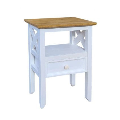 Masivní noční stolek PROVENCE je spojením bukového a dubového dřeva. Dubové dřevo (horní deska) je ošetřeno lakem a bukového dřevo je ošetřeno akrylovou barvou. Šuplíky jsou bez pojezdu. Možnost objednání se systémem tichého dovírání (u šuplíků). Příplatek 810,- Kč (jeden pár).