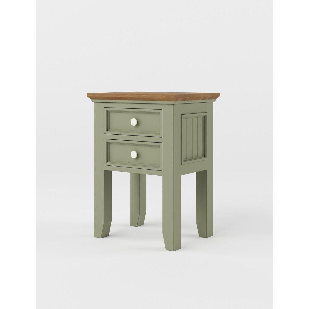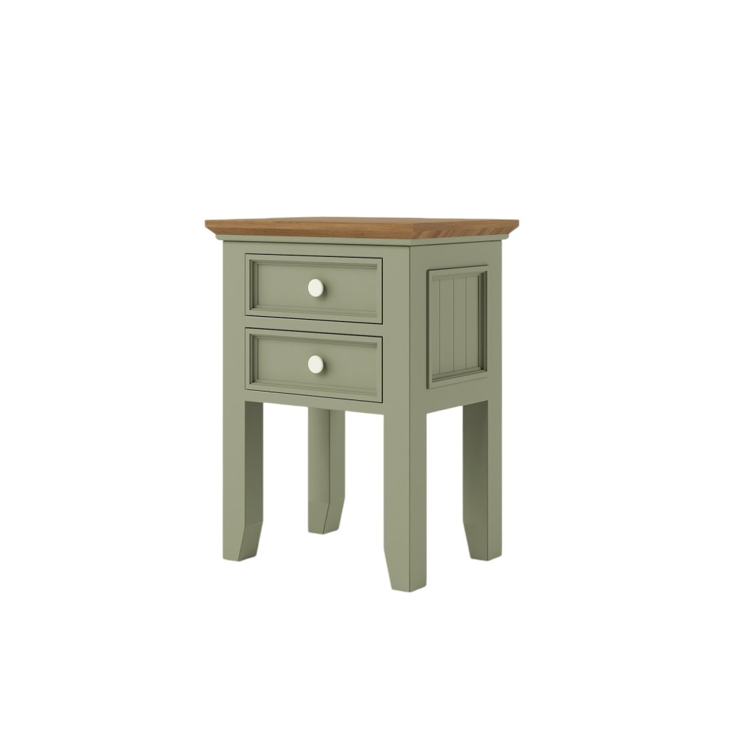 Noční stolek z masivu PROVENCE je noční stolek vyrobený z masivního bukového dřeva, které je ošetřeno akrylovou barvou v olivovém odstínu, a z masivního dubového dřeva (horní deska), které je ošetřeno lakem. Díky spojení těchto dvou druhů masivního dřeva získal noční stolek jedinečný vzhled, který zdokonalí veškerý interiér.