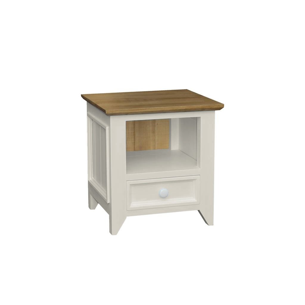 Noční stolek z masivu PROVENCE je noční stolek vyrobený z masivního bukového dřeva, které je ošetřeno akrylovou barvou v krémové odstínu, a z masivního dubového dřeva (horní deska), které je ošetřeno lakem. Díky spojení těchto dvou druhů masivního dřeva získal noční stolek jedinečný vzhled, který zdokonalí veškerý interiér.