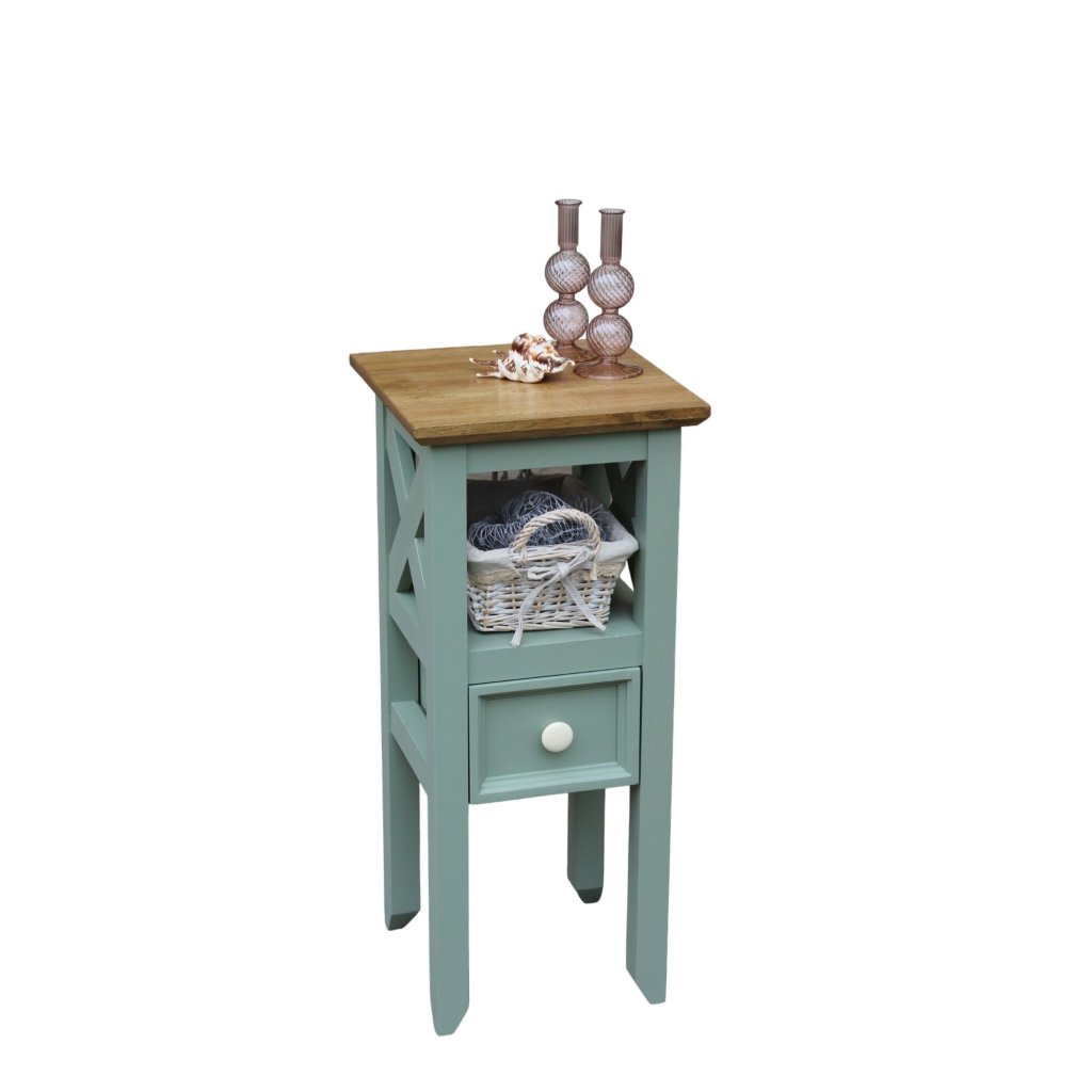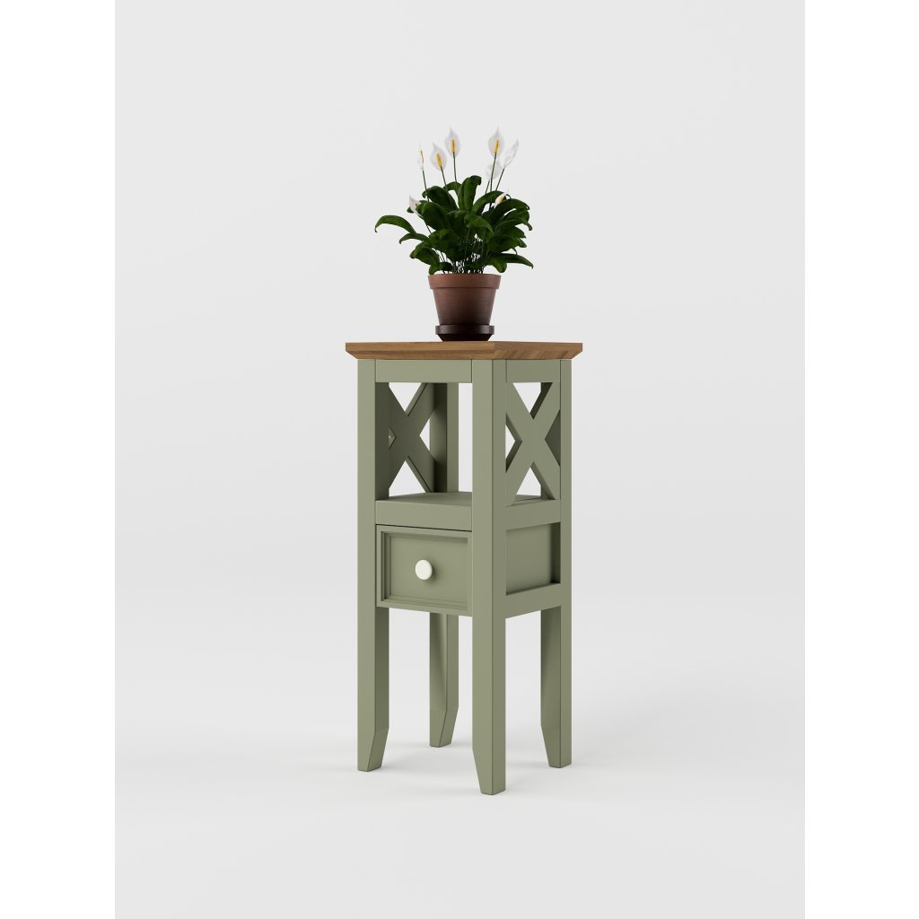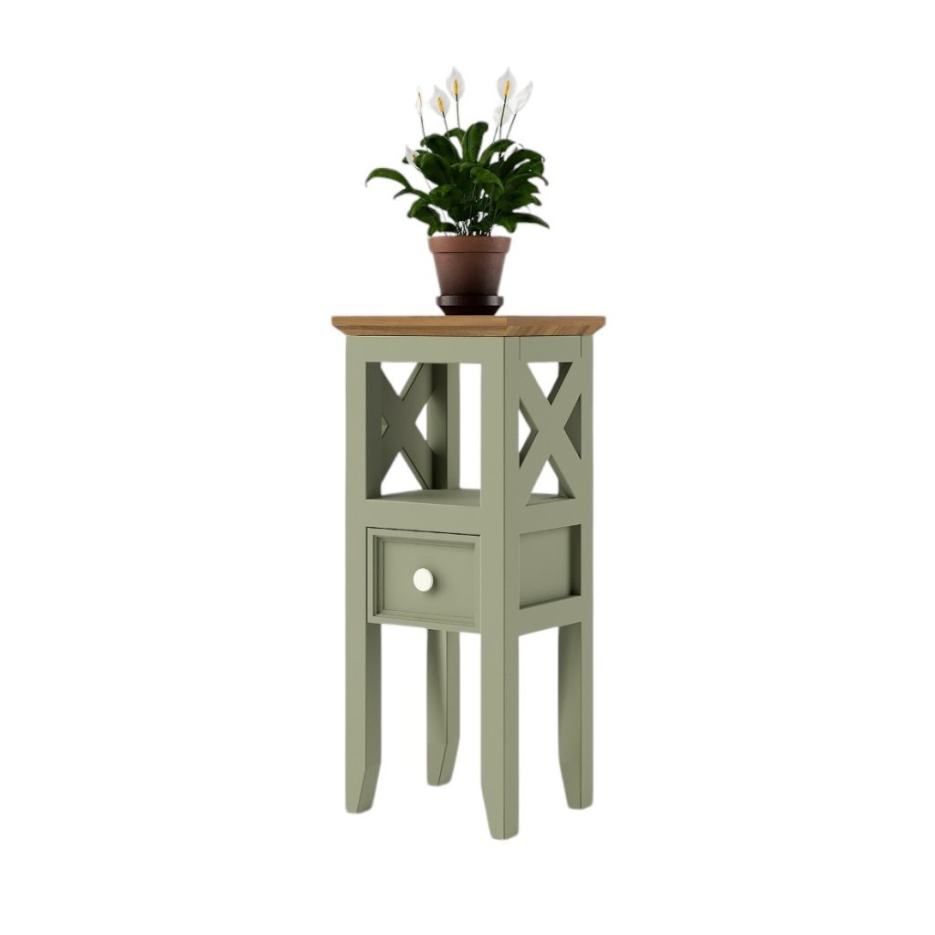 Masivní stolek PROVENCE je spojením bukového a dubového dřeva. Dubové dřevo (horní deska) je ošetřeno lakem a bukového dřevo je ošetřeno akrylovou barvou v olivové barvě. Šuplík je bez pojezdů.