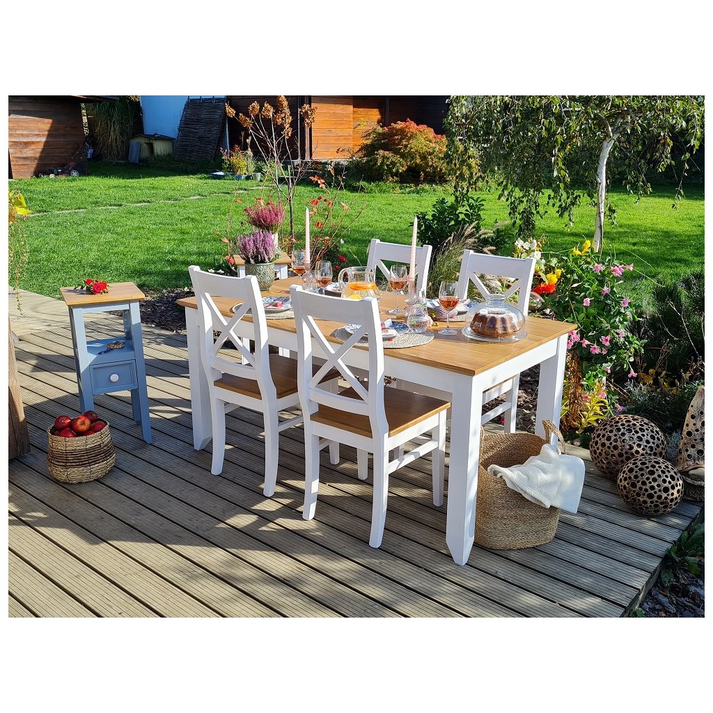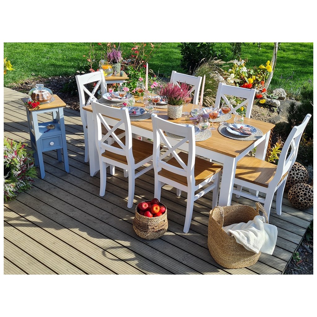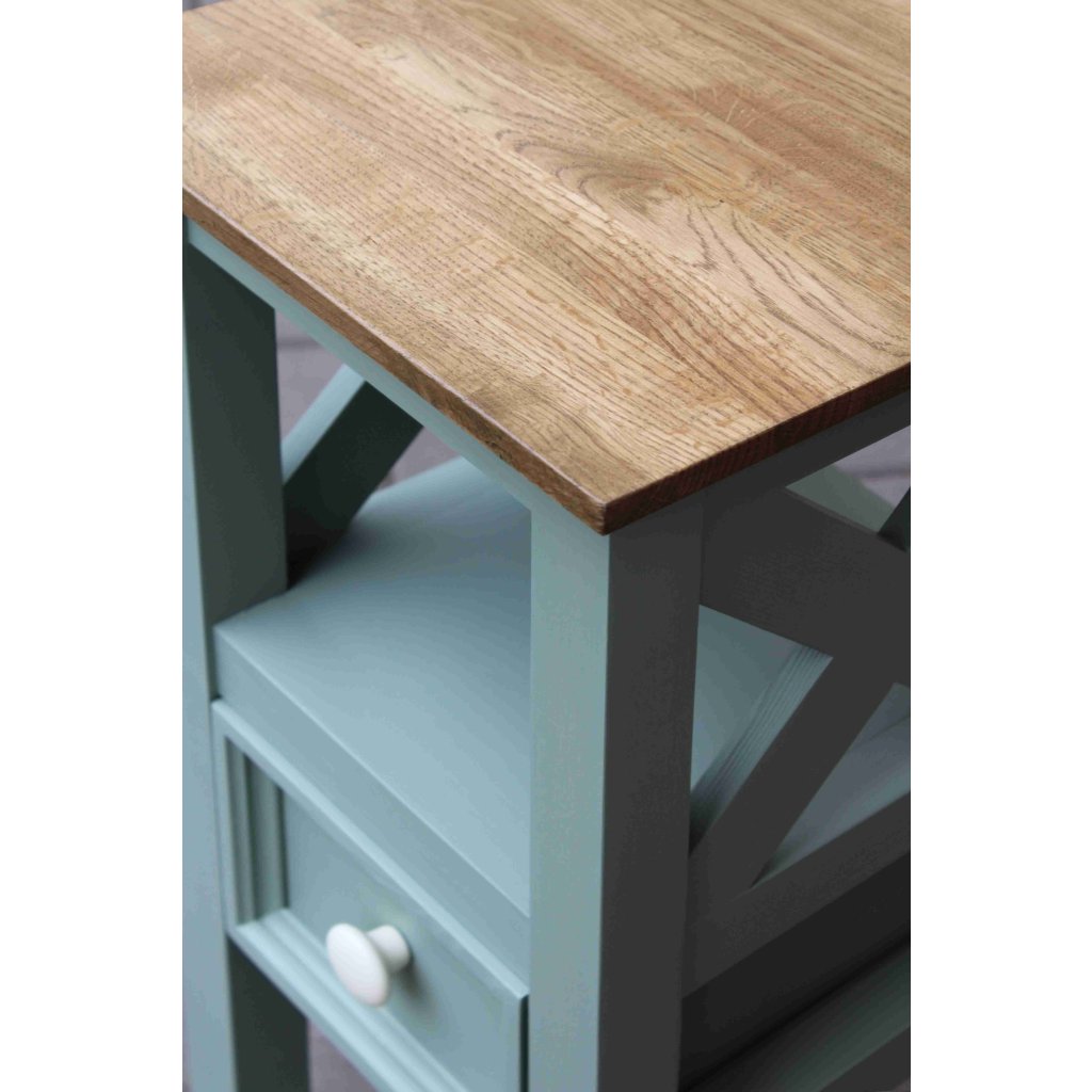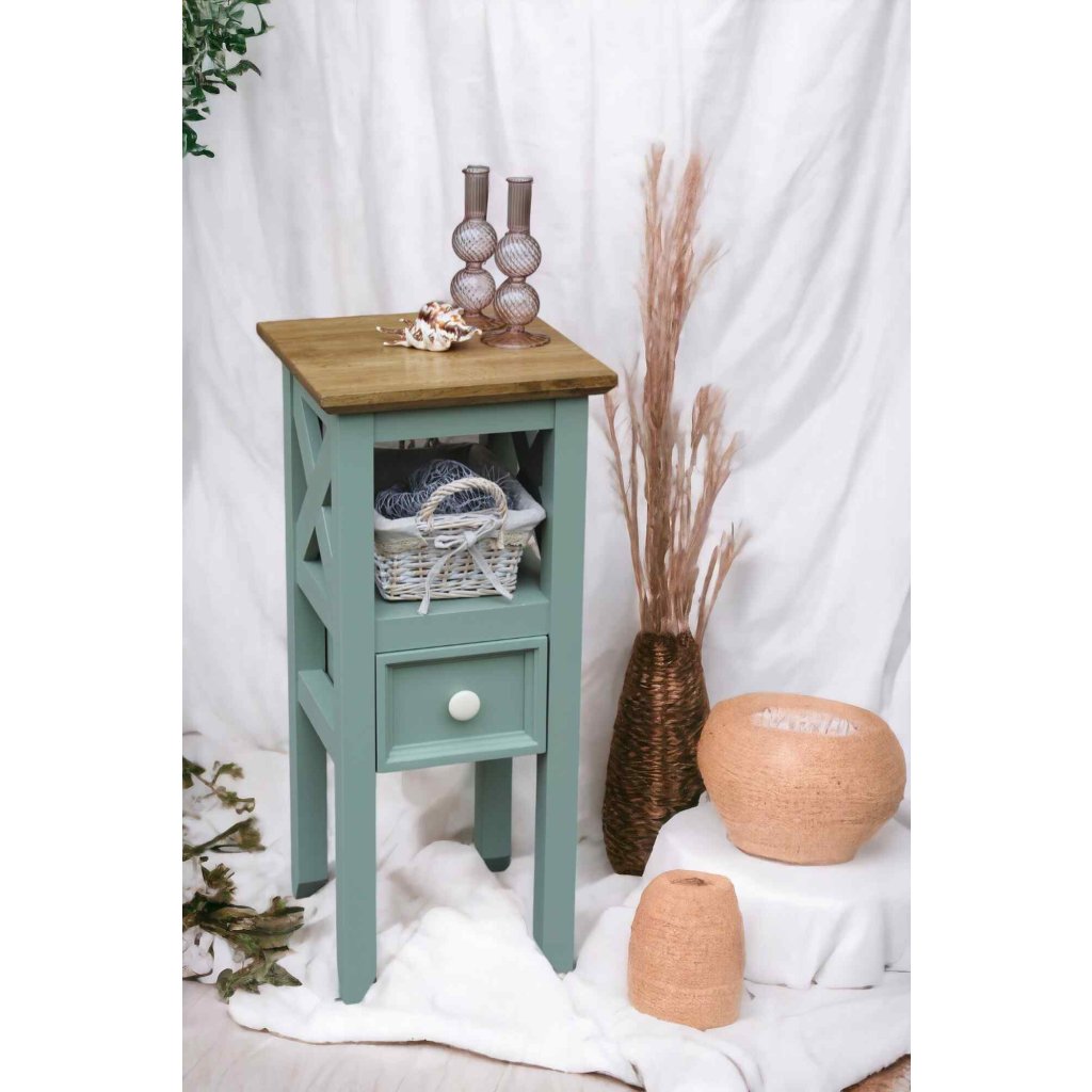 Masivní stolek PROVENCE je spojením bukového a dubového dřeva. Dubové dřevo (horní deska) je ošetřeno lakem a bukového dřevo je ošetřeno akrylovou barvou v olivové barvě. Šuplík je bez pojezdů.