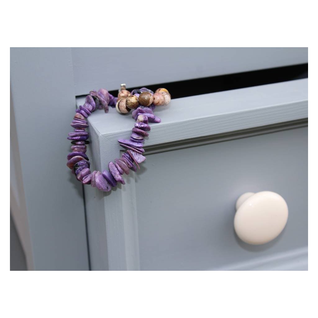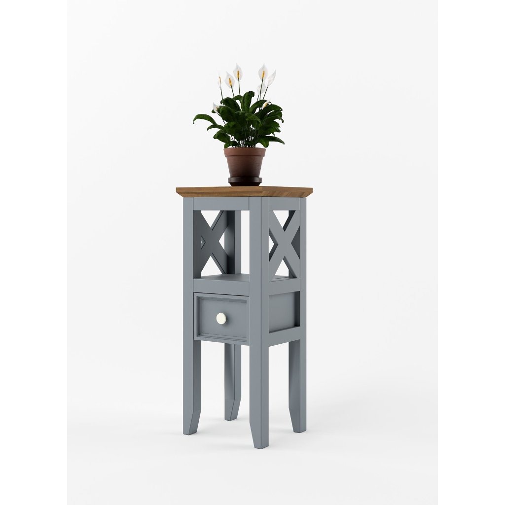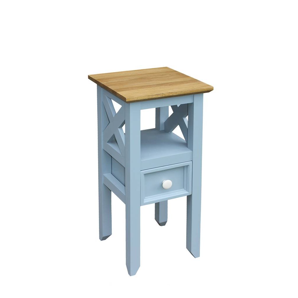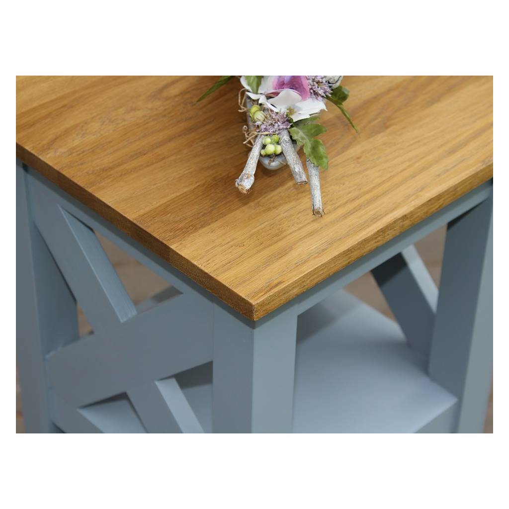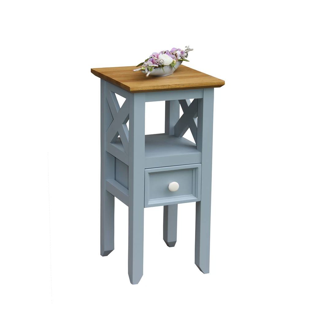 Masivní stolek PROVENCE je spojením bukového a dubového dřeva. Dubové dřevo (horní deska) je ošetřeno lakem a bukového dřevo je ošetřeno akrylovou barvou v šedomodré barvě. Šuplík je bez pojezdů.
