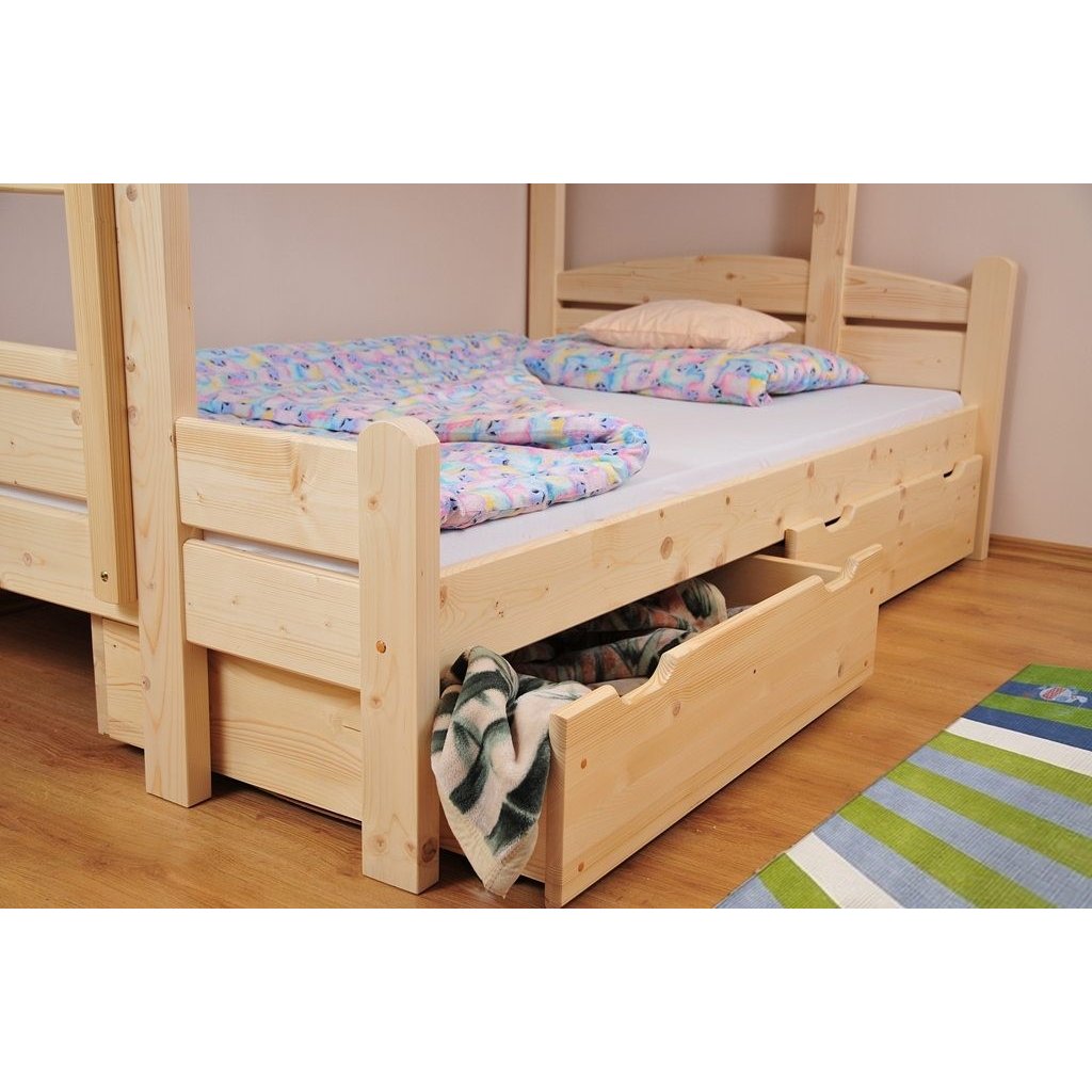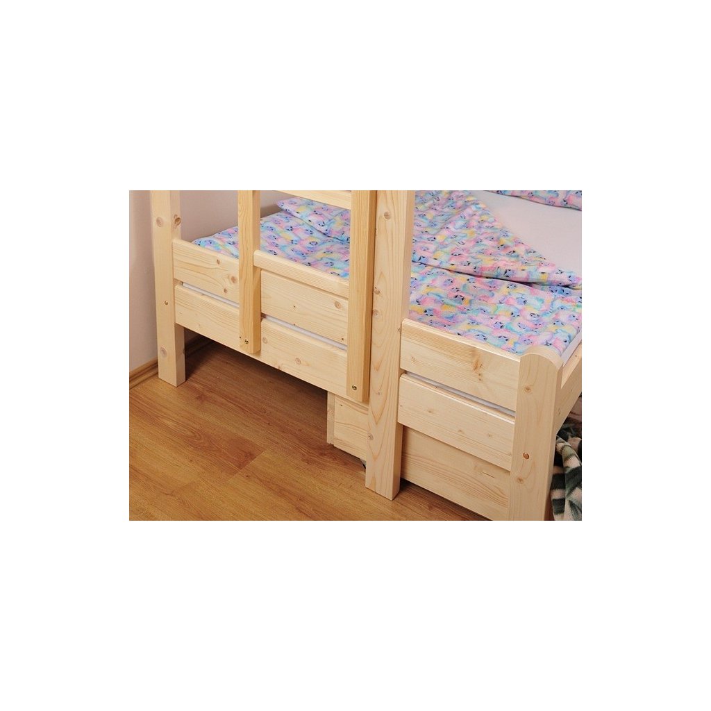 Patrová postel Jarda je určená až pro 3 osoby jakékoliv věkové kategorie. Je ručně vyrobená ze smrkového masivního dřeva, spojuje se pomocí mosazných šroubů a dřevěných kolíků. Postel vyniká svou robustní a odolnou konstrukci lůžka, má masivní a stabilní nohy (4,5 x 9 cm). Z hlediska bezpečnosti oceníte zaoblené hrany a bezpečnostní bariéry (15cm, přední i zadní). Součásti postele jsou 2 hluboké a prostorné zásuvky na kolečkách, které jdou zcela vytáhnout z pod postele. Na lakování postele jsou použity ekologické barvy ředitelné vodou, díky kterým si postel zachová hezký a dlouhotrvající lesk.