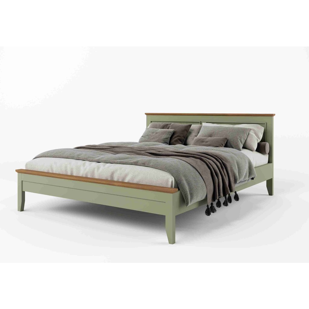 Masivní postel PROVENCE je spojením bukového a dubového dřeva. Dubové dřevo (horní deska) je ošetřeno lakem a bukové dřevo je ošetřeno akrylovou barvou v olivové barvě.