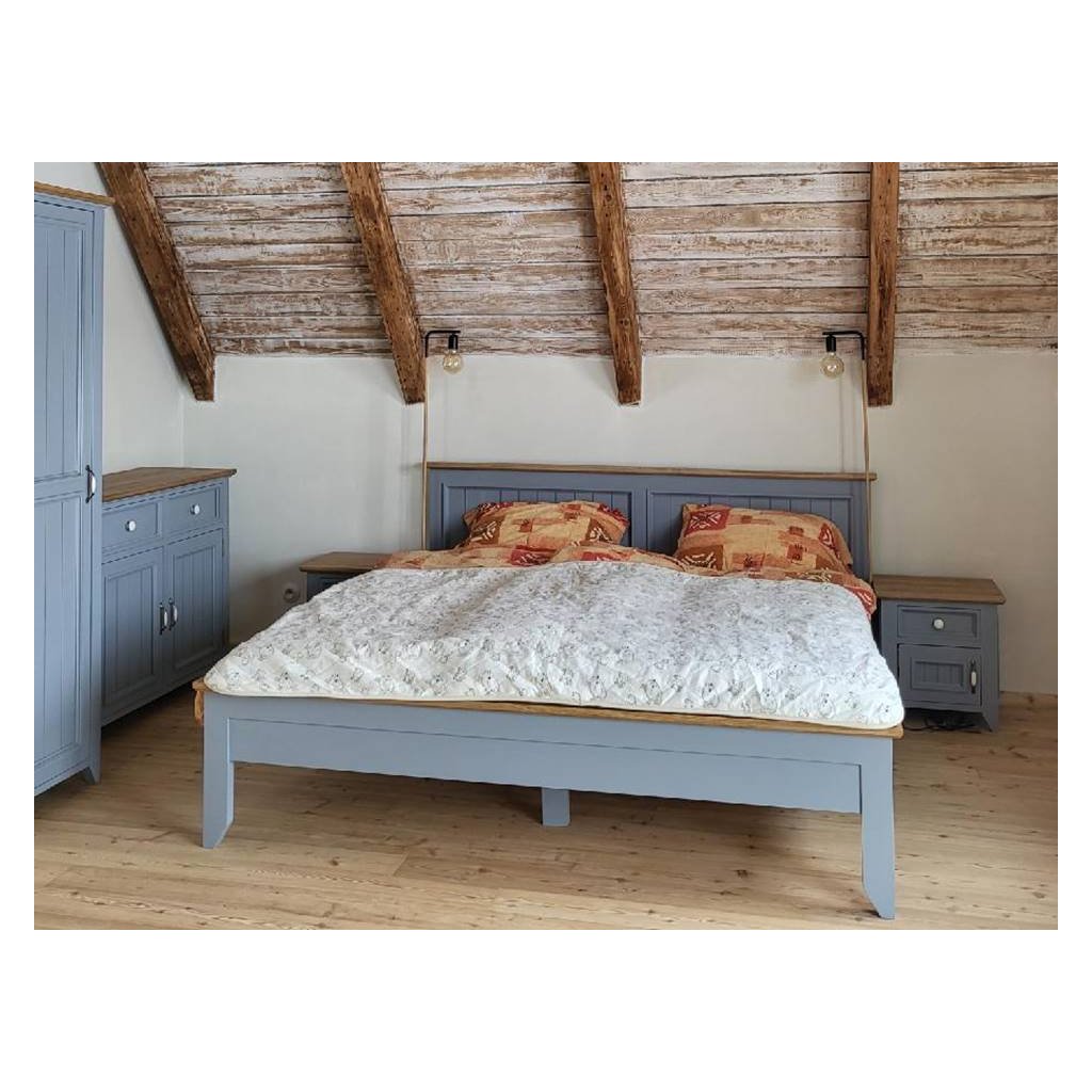 Masivní postel PROVENCE je spojením masivního bukového a dubového dřeva. Dubové dřevo (horní deska) je ošetřeno lakem a bukové dřevo je ošetřeno akrylovou barvou v olivové barvě.