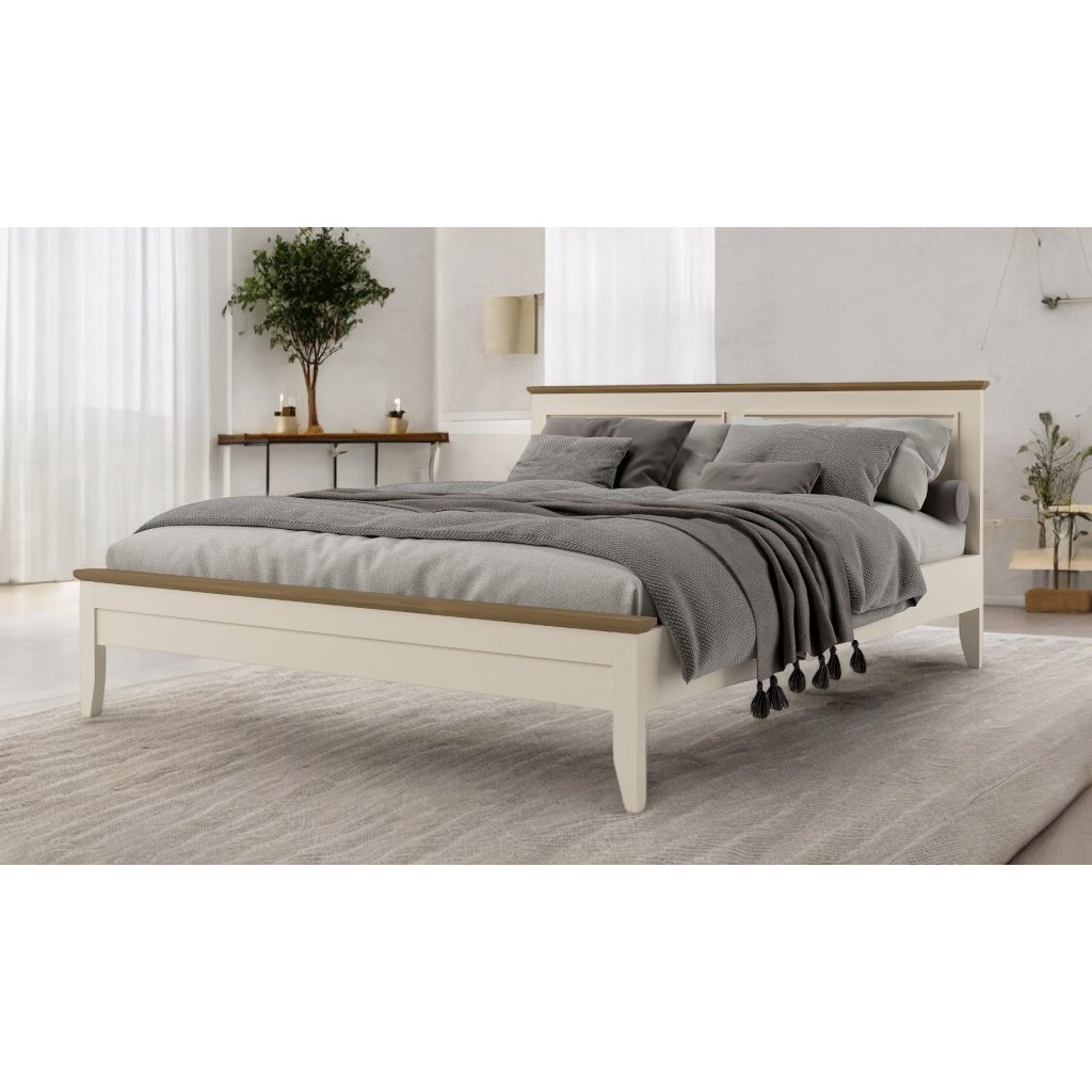 Masivní postel PROVENCE je spojením masivního bukové a dubového dřeva. Dubové dřevo (horní deska) je ošetřeno lakem a bukové dřevo je ošetřeno akrylovou barvou v krémové barvě.
