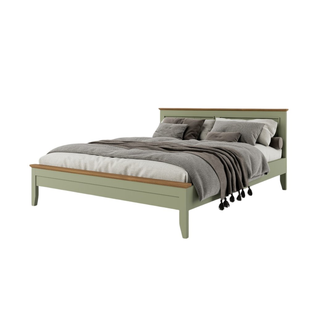 Masivní postel PROVENCE je spojením masivního bukové a dubového dřeva. Dubové dřevo (horní deska) je ošetřeno lakem a bukové dřevo je ošetřeno akrylovou barvou v olivové barvě.