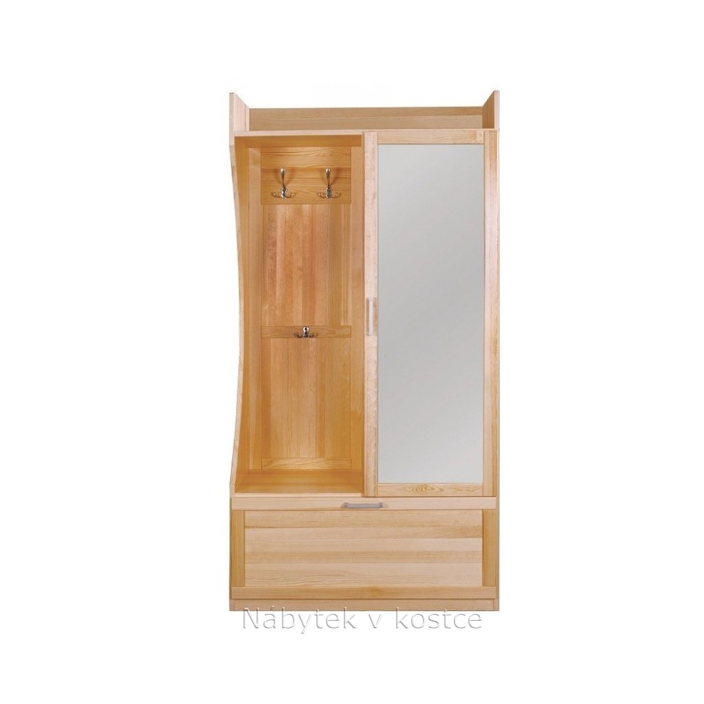 Předsíň z masivu DEJ80 je vyrobená z borovicového masivu. Pouze zadní část je ze sololitu. Výrobce klade důraz na čím jak nejmenší výskyt suků. Šatník DEJ80 má dole úložný prostor otevíratelný dvířky směrem dolů. V pravé části se nachází zrcadlo, za nímž se skrývá výsuvná tyč, na kterou si můžete pověsit například kabát. V levo nahoře jsou umístěny dva trojité háčky a uprostřed jeden dvojitý háček. V horní částí šatníku je polička, kterou oceníte při skladování sezónního oblečení. Předsíň z masivu DEJ80 je zkrátka plná úložného prostoru, kterého není nikdy dost.