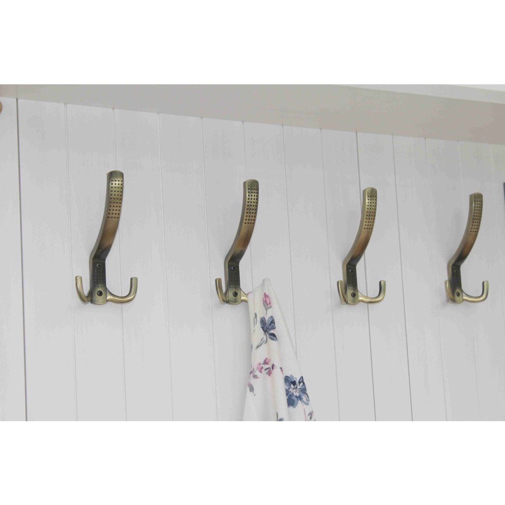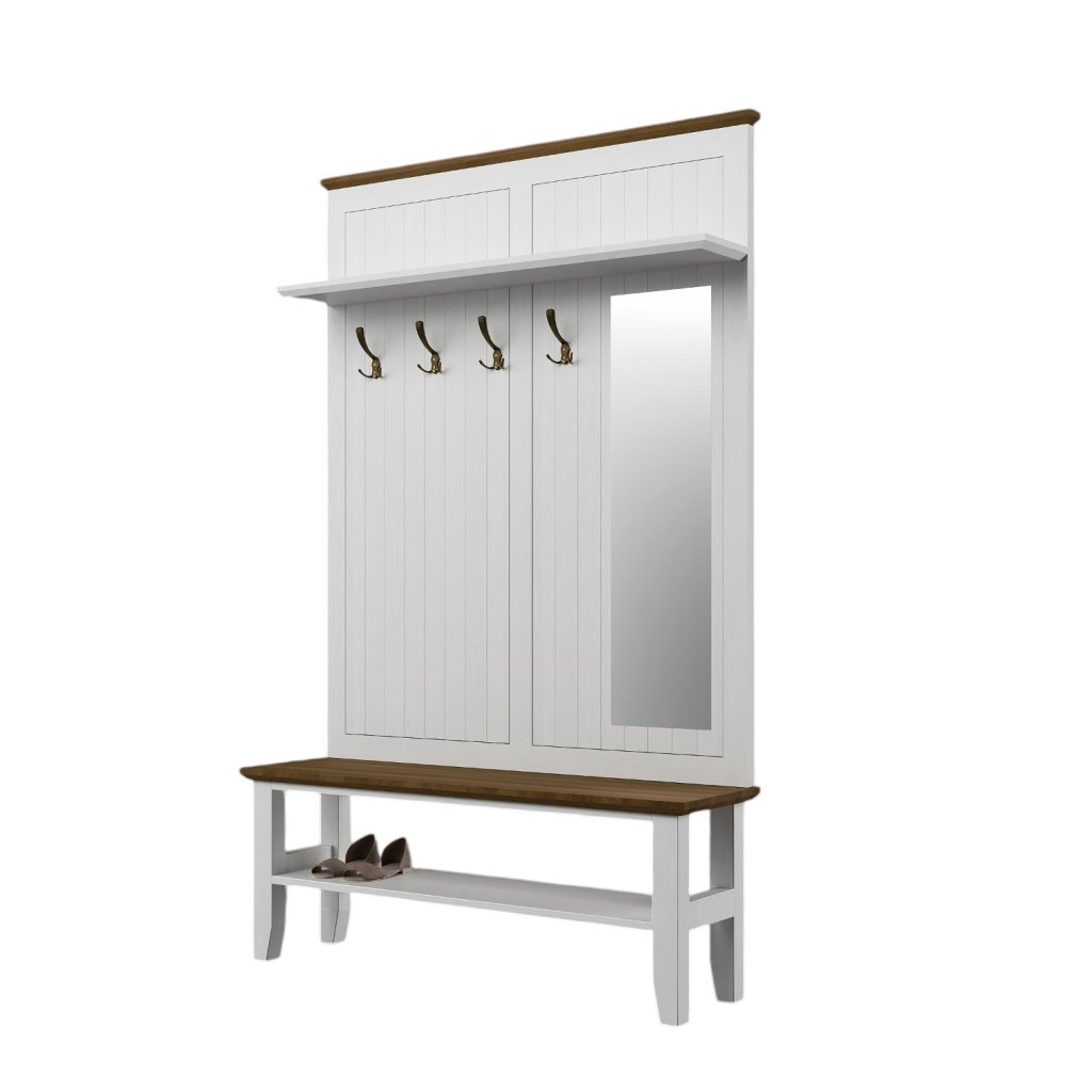 Masivní předsíňová stěna PROVENCE je spojením bukového a dubového dřeva. Dubové dřevo (horní deska) je ošetřeno lakem a bukové dřevo je ošetřeno akrylovou barvou v bílé barvě.