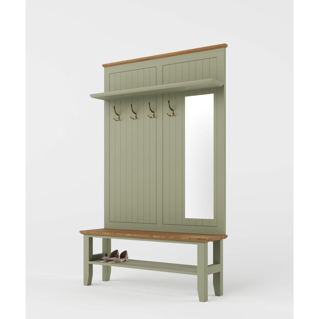 Masivní předsíňová stěna PROVENCE je věšáková stěna vyrobená z masivního bukového dřeva, které je ošetřeno akrylovou barvou v olivovém odstínu, a z masivního dubového dřeva (horní deska), které je ošetřeno lakem. Díky spojení těchto dvou druhů masivního dřeva získala masivní stěna jedinečný vzhled, který zdokonalí Vaši předsíň.