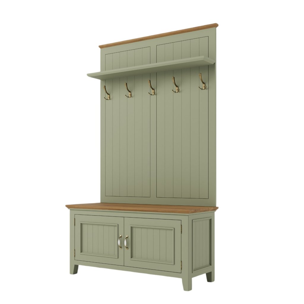 Masivní předsíňová stěna PROVENCE je věšáková stěna se skříňkou vyrobená z masivního bukového dřeva, které je ošetřeno akrylovou barvou v olivovém odstínu, a z masivního dubového dřeva (horní deska), které je ošetřeno lakem. Díky spojení těchto dvou druhů masivního dřeva získala masivní stěna jedinečný vzhled, který zdokonalí Vaši předsíň.