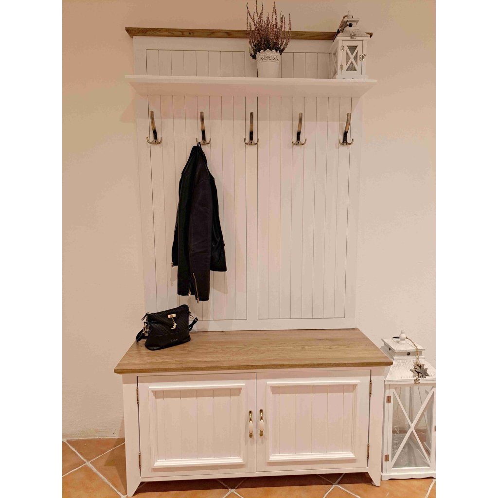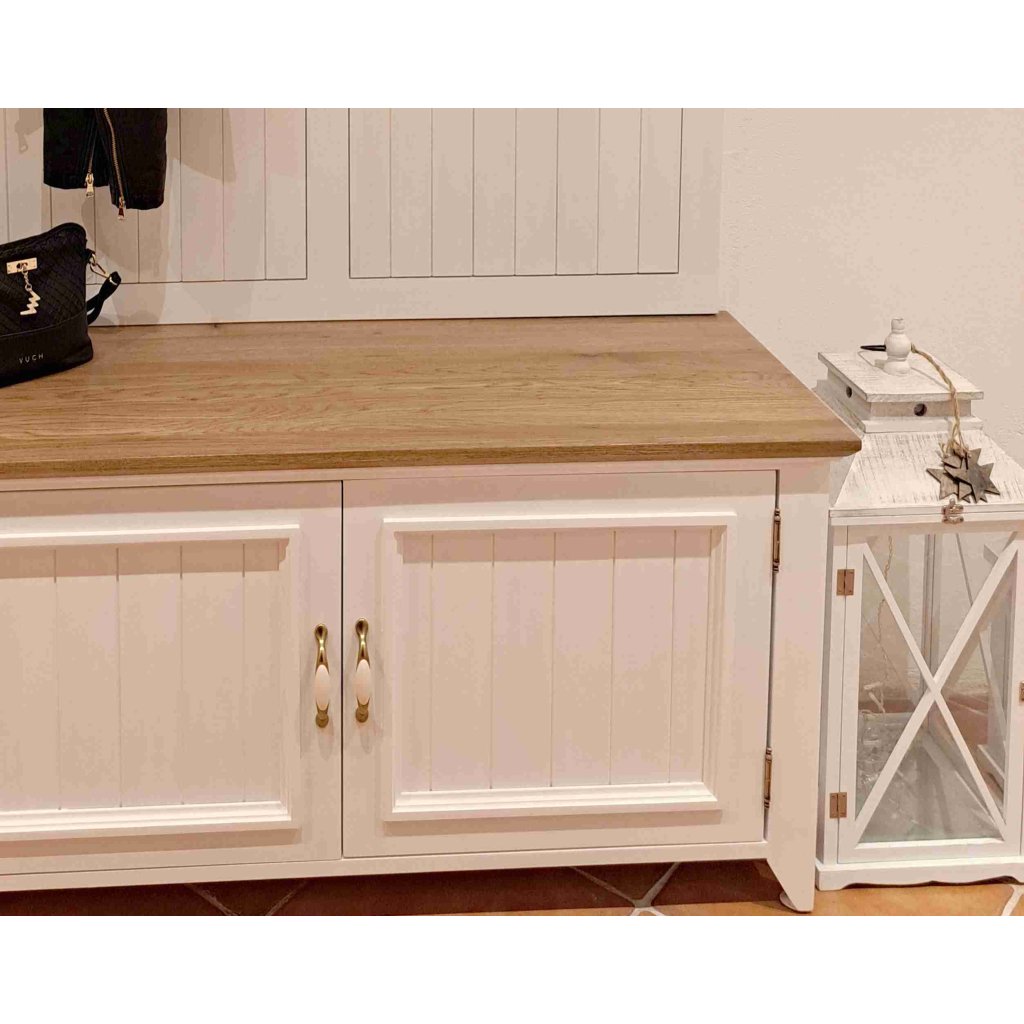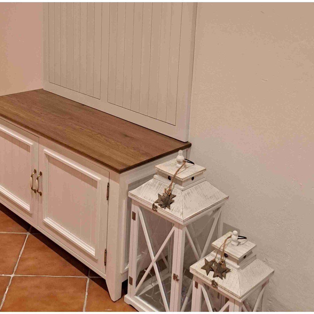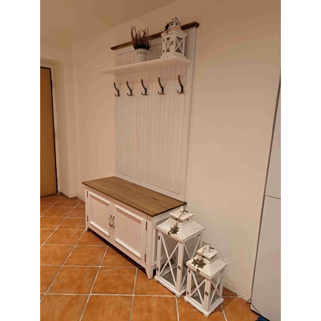 Masivní předsíňová stěna PROVENCE je spojením bukového a dubového dřeva. Dubové dřevo (horní deska) je ošetřeno lakem a bukové dřevo je ošetřeno akrylovou barvou v bílé barvě.