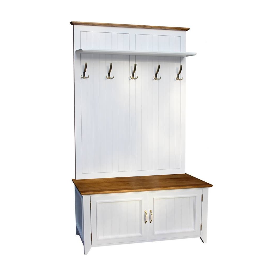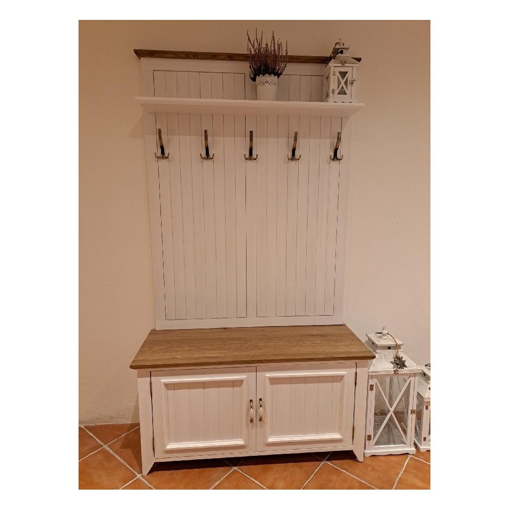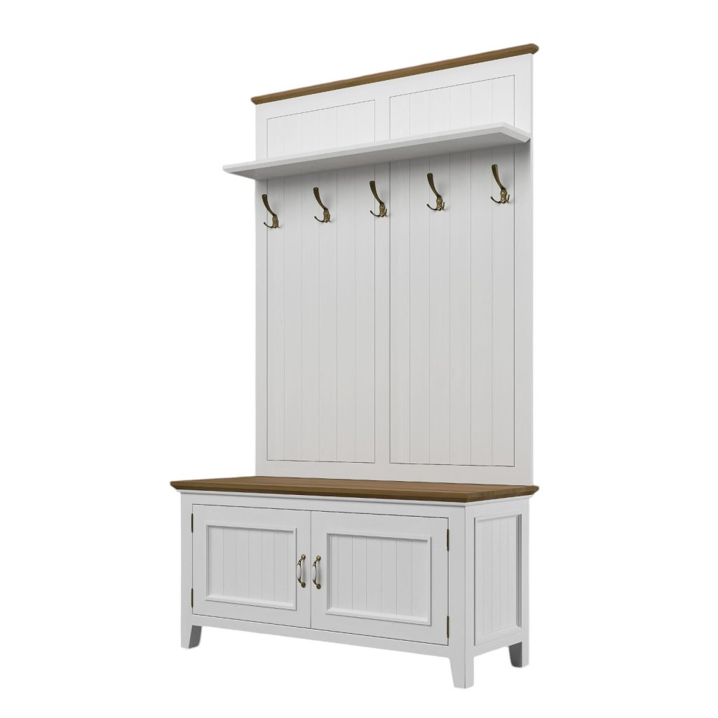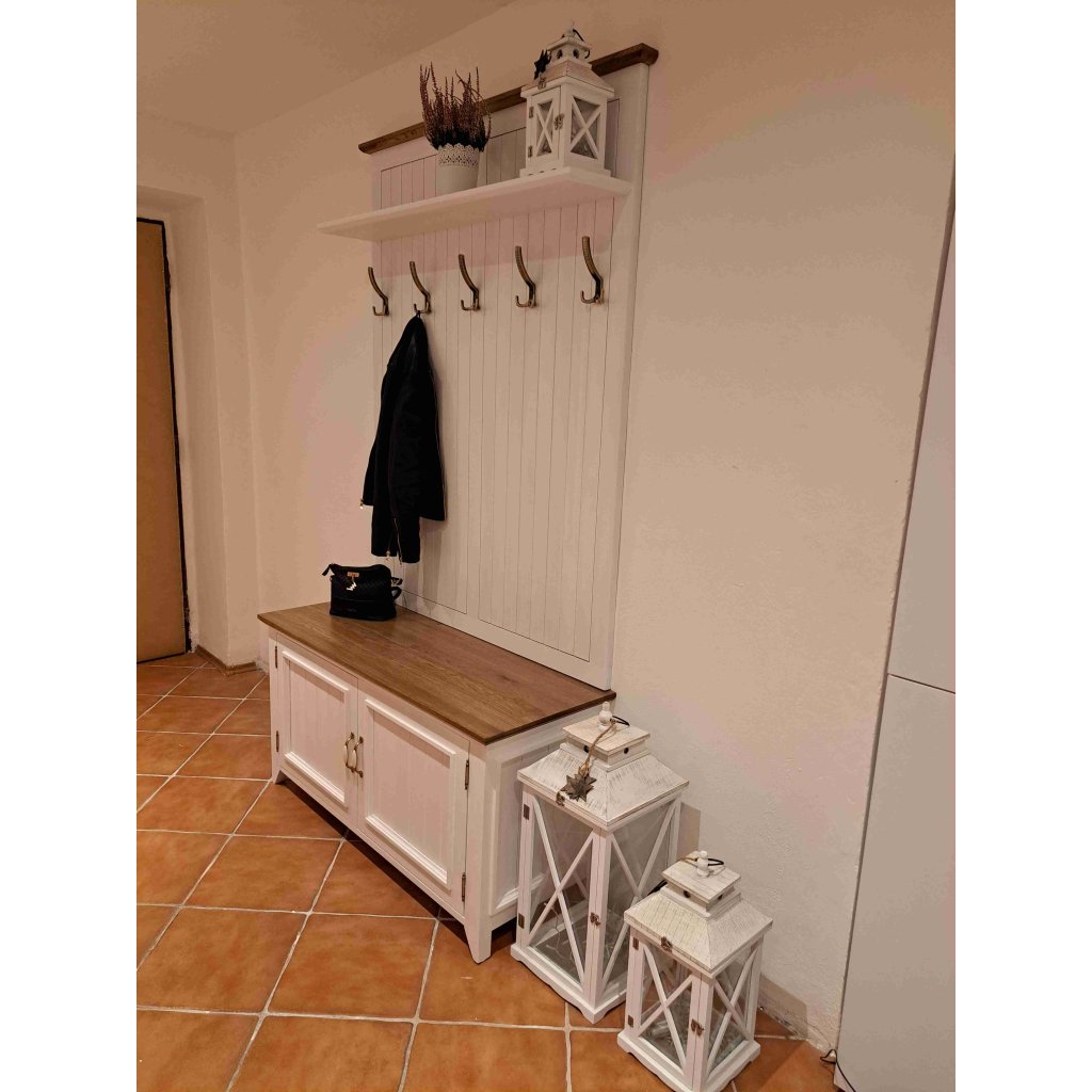 Masivní předsíňová stěna PROVENCE je spojením bukového a dubového dřeva. Dubové dřevo (horní deska) je ošetřeno lakem a bukové dřevo je ošetřeno akrylovou barvou v bílé barvě.