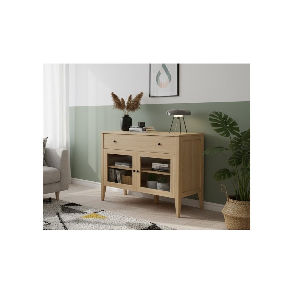 Prosklená komoda ROMA KT6 v přírodní barvě představuje dokonalé spojení poctivého truhlářského řemesla a moderního designu. Vyrobena z kvalitního bukového masivu, který vyniká pevností a krásnou kresbou dřeva. Kombinuje prosklenou část pro vystavení dekorací s uzavřeným prostorem a šuplíkem pro praktické uložení věcí. Díky nadčasovému vzhledu se skvěle hodí do obývacího pokoje, jídelny i pracovny.