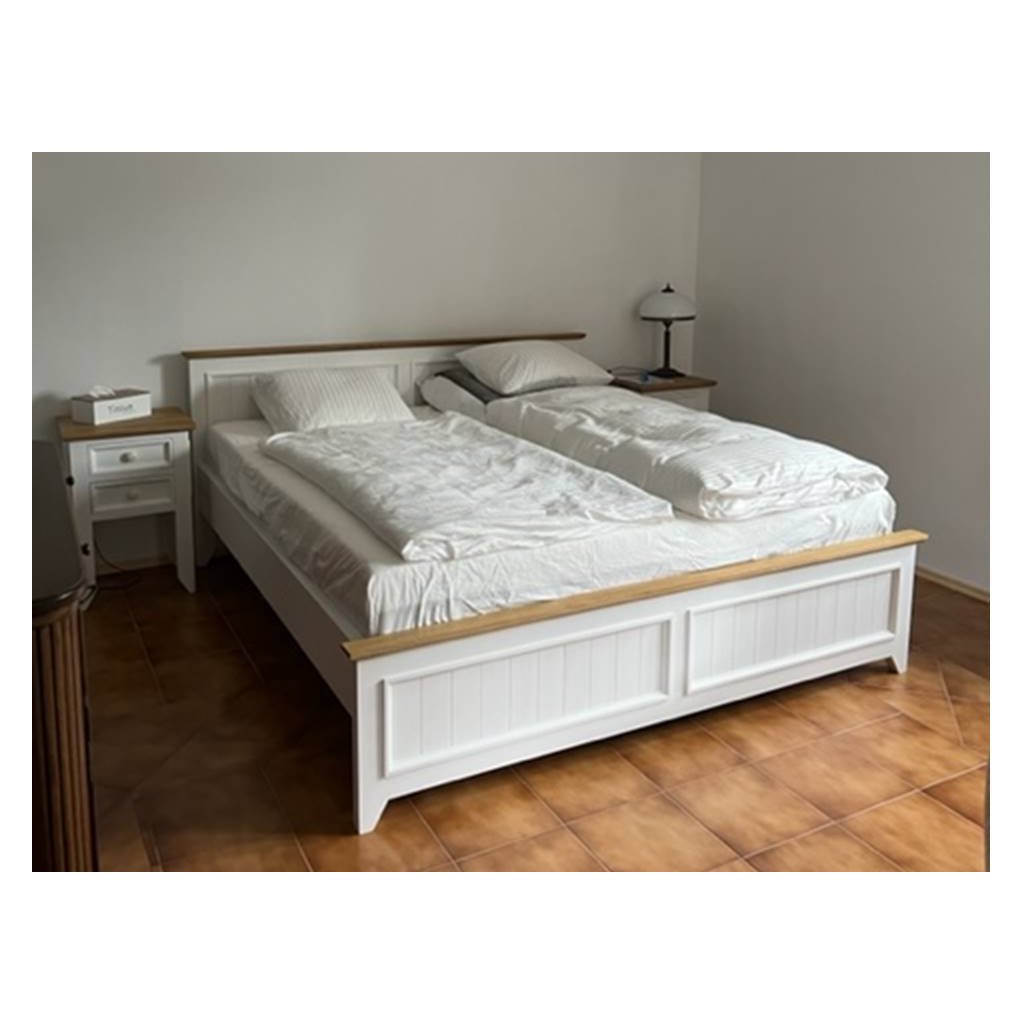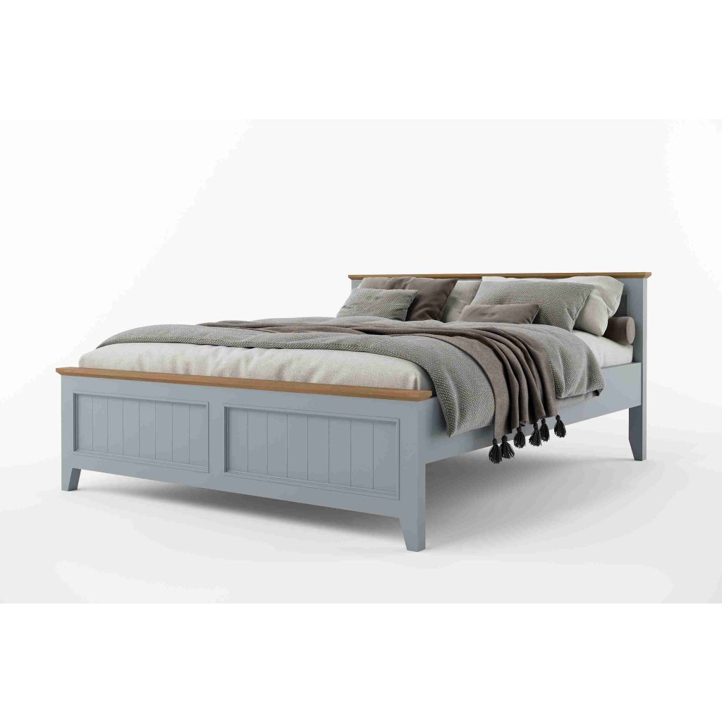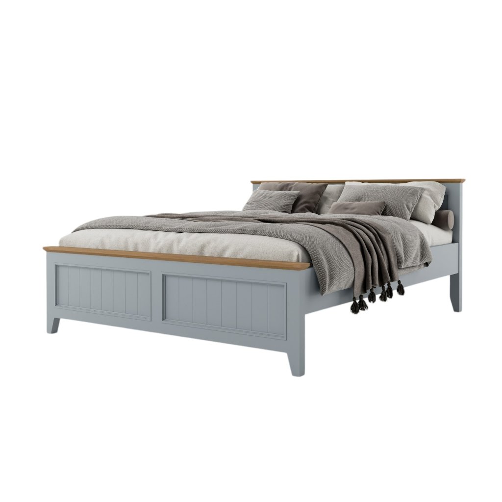 Masivní postel PROVENCE je spojením bukového a dubového dřeva. Dubové dřevo (horní deska) je ošetřeno lakem a bukové dřevo je ošetřeno akrylovou barvou v šedomodré barvě.